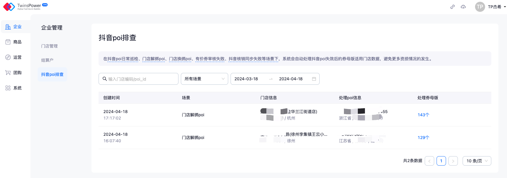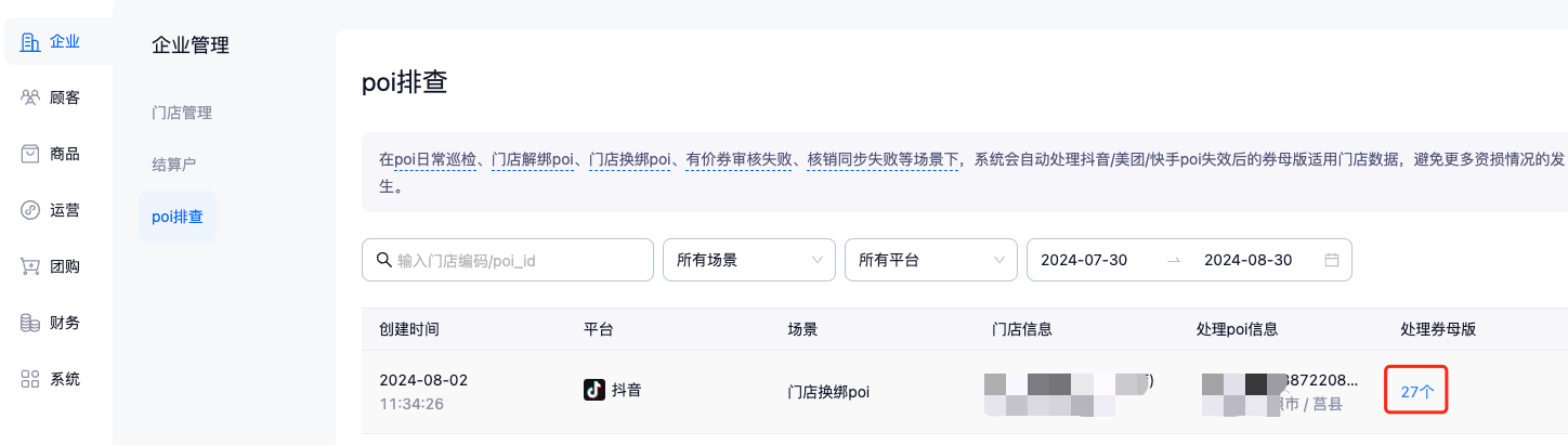 在POI日常巡检、门店解绑POI、门店换绑POI、有价券审核失败、核销同步失败等场景下,系统会自动处理抖音/美团/快手POI失效后的券母版适用门店数据,避免更多资损情况的发生。因此可在此处查看poi信息变更或被禁用所牵连的有价券信息。