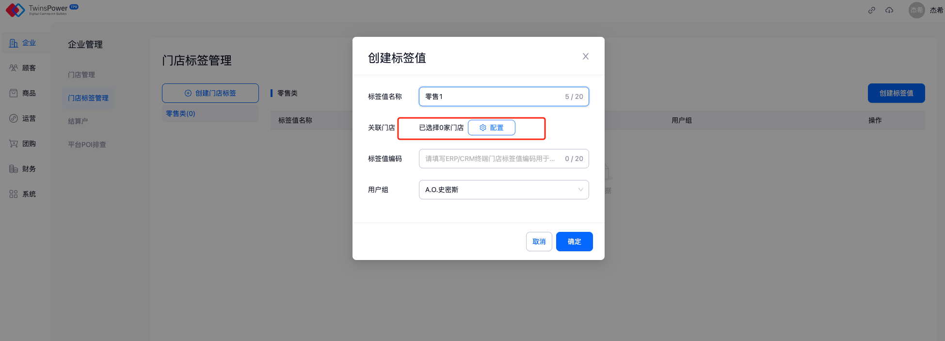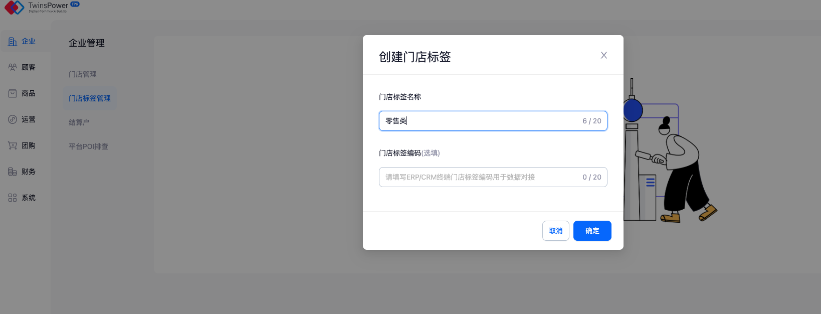 - 输入标签名称,门店标签编码(选填),示例:零售类
