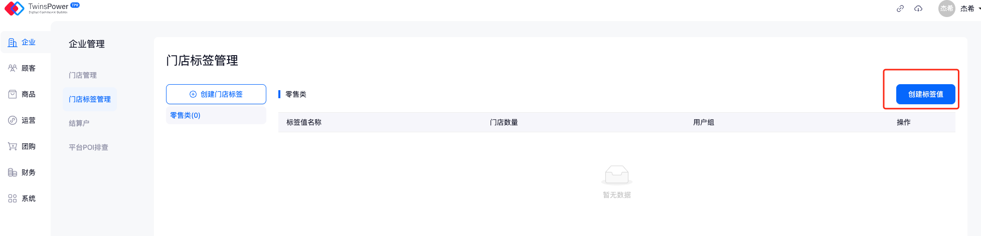 - 输入标签值名称,示例:零售类可以具体拆分成“超市”、“便利店”等
