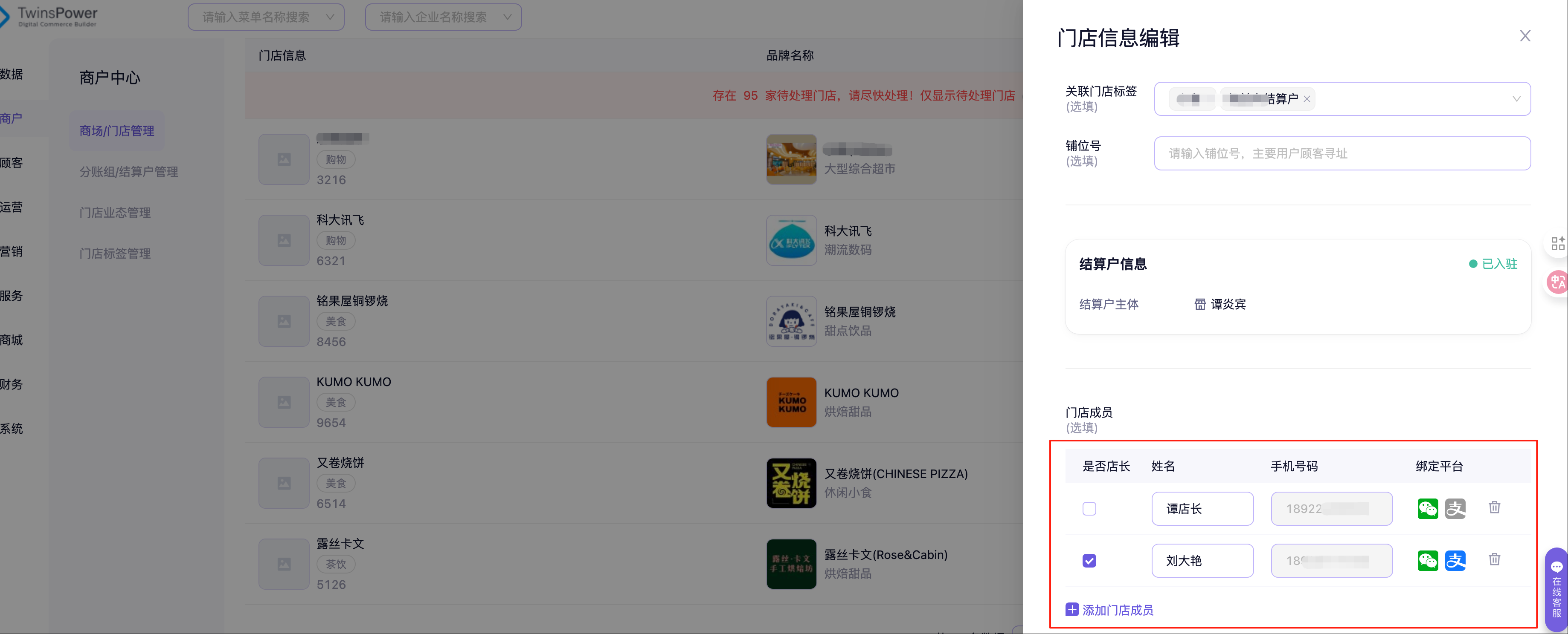- 门店成员:可在门店信息编辑页新增/修改/删除门店成员信息,对应的微信/支付宝图标亮起时,则表示该成员已经登陆过微信商管云或支付宝商管云。