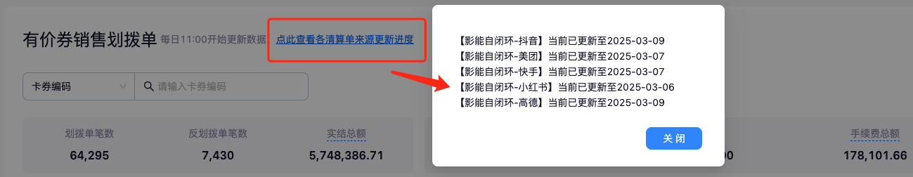 📅每日11:00开始更新清算单,下午15:00开始结算,当具有多平台(抖音/小红书/美团等)有价券业务时,因各平台出账周期不同,可点击查看各清算单来源更新进度。