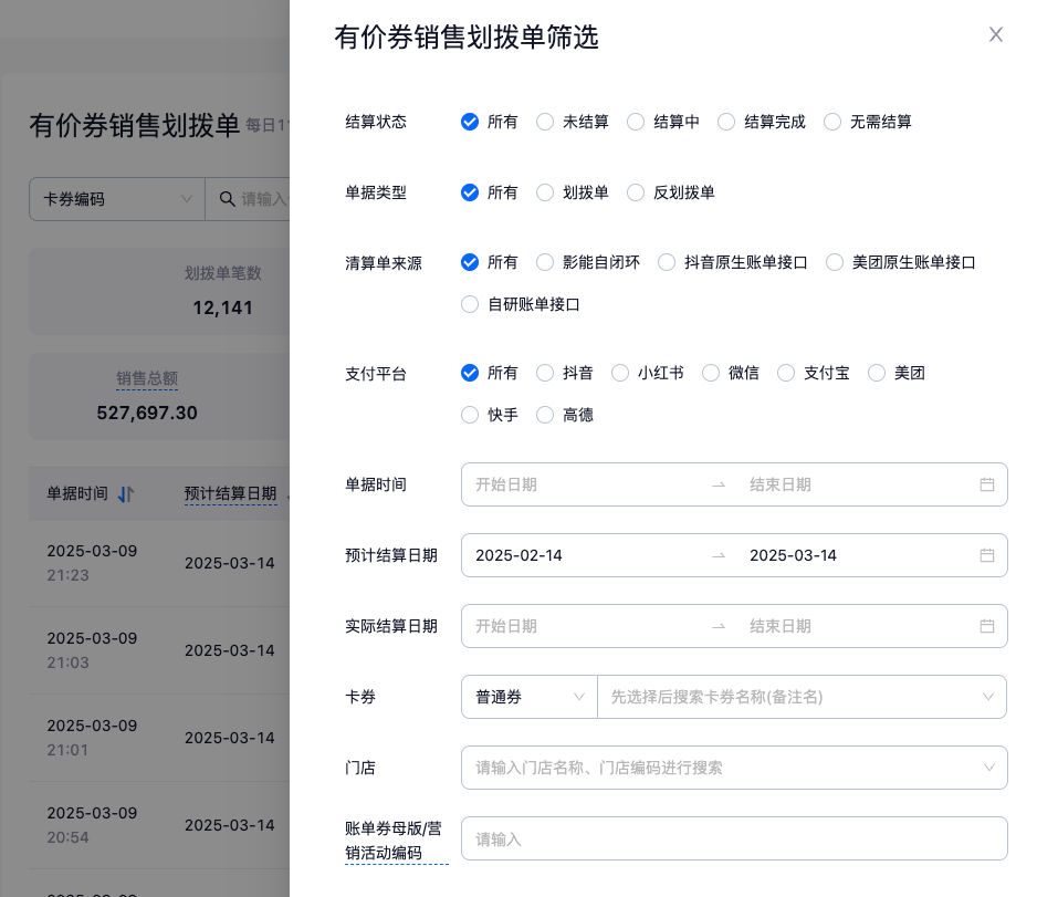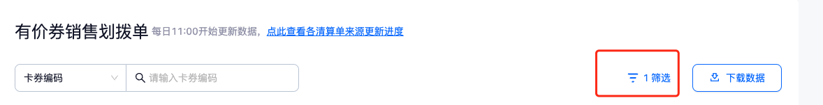 当我们需要按照结算状态、支付平台查看某一类的有价券划拨单时,我们可以通过筛选的方式,查看特定属性的划拨单数据。