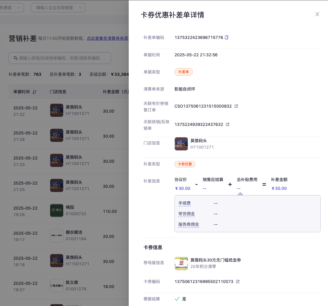 当有价券设置了手续费承担方、服务商佣金承担方或者带货佣金承担方为总部时,或设置了协议价>实际售价时,相关差值将会生成对应的补差账单,总部可按照该补差单对门店进行线下补贴结算。