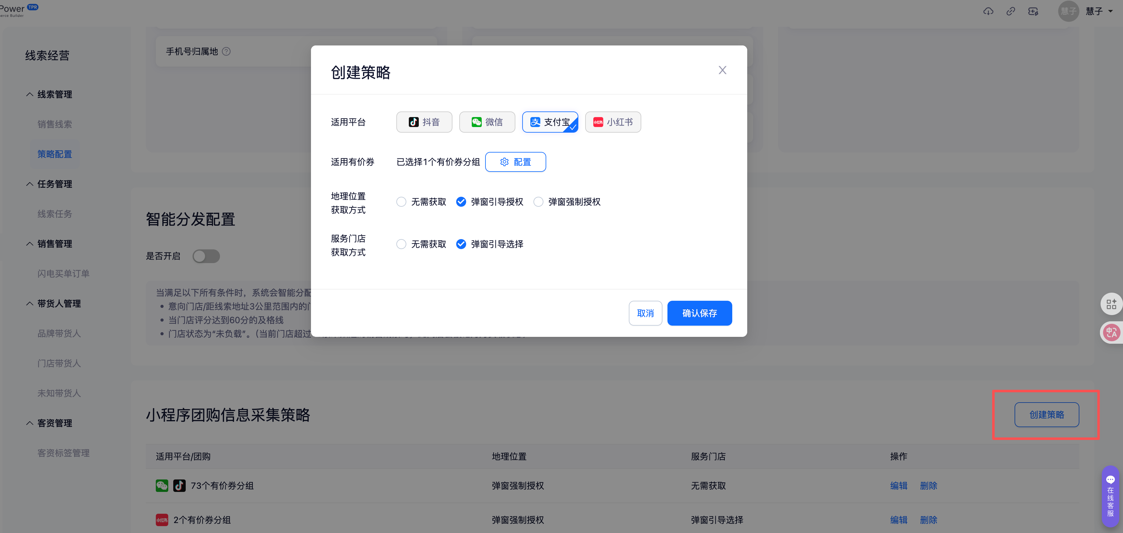- 适用平台:可针对微信 / 支付宝 / 抖音 / 小红书小程序分别配置,一个平台只可以有一个策略