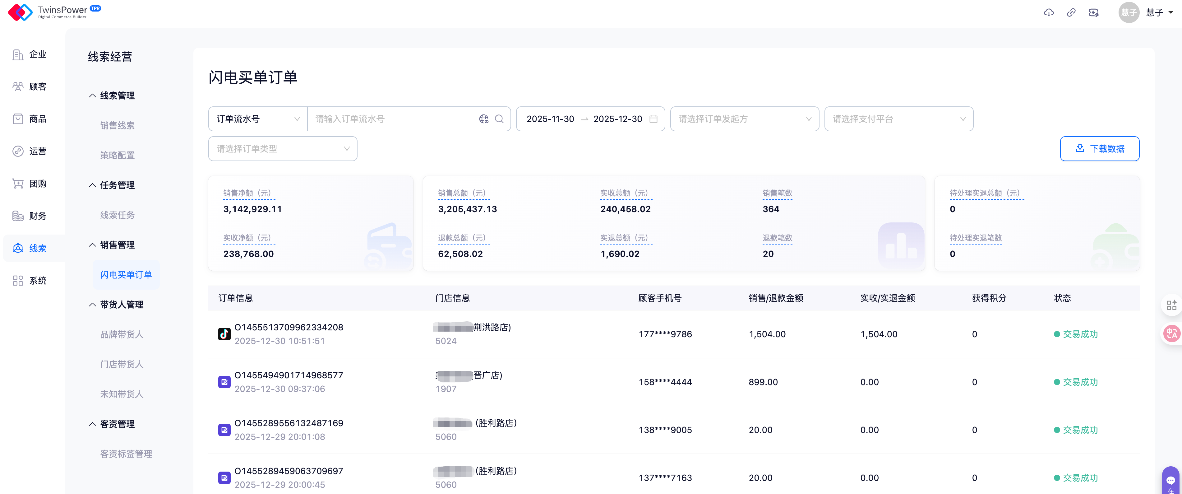 包含 闪电买单订单、人工录单、抖音在线买单 的全部订单数据,支持订单数据导出,便于复盘门店成交情况。