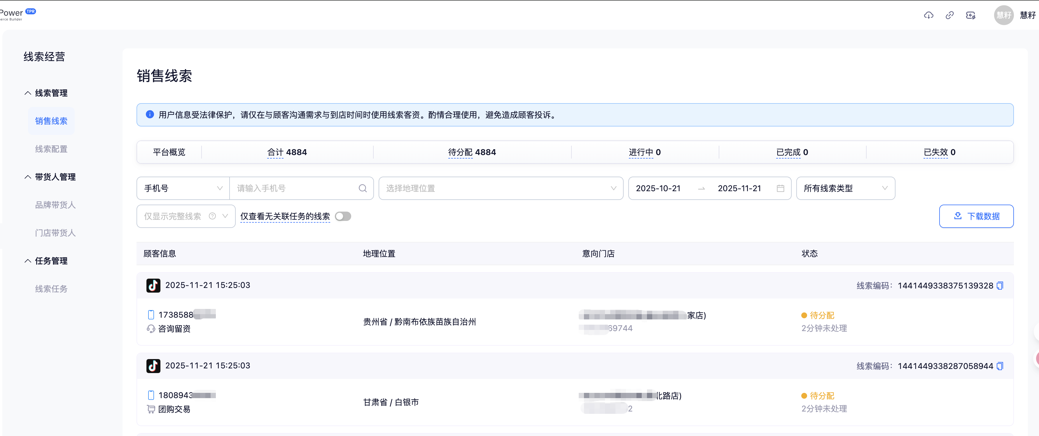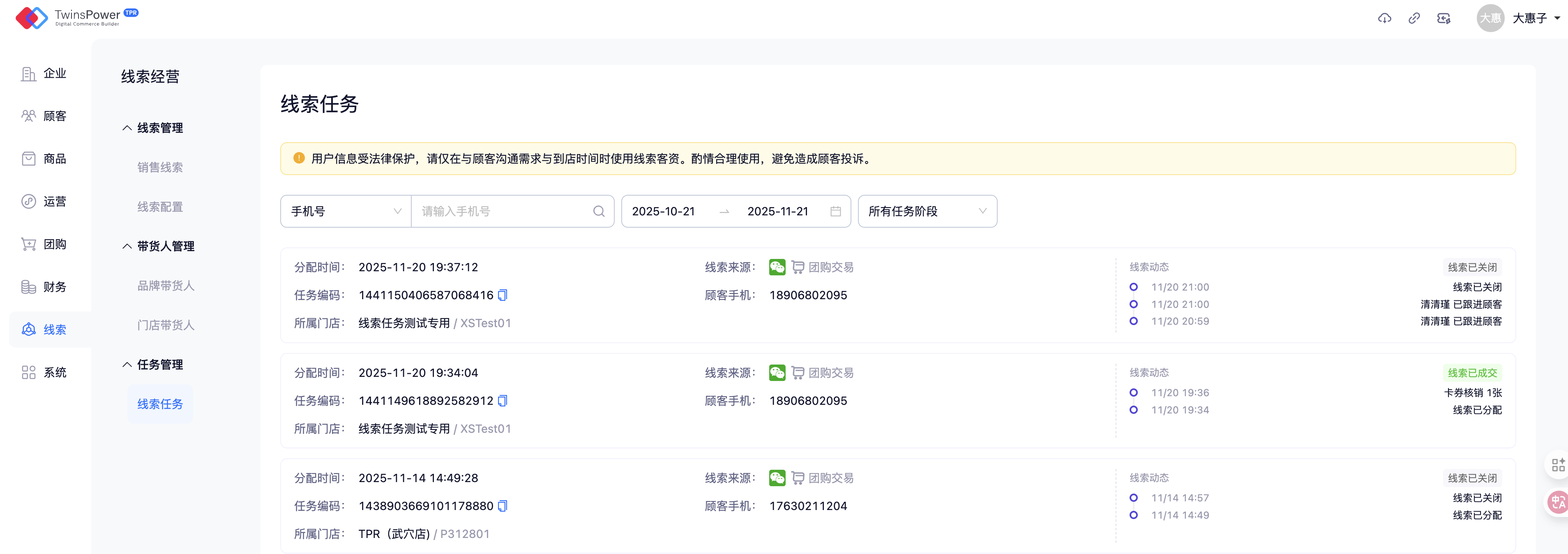 线索任务是连接「线索分发」与「门店跟进转化」的核心模块,用于承接分配至门店的销售线索,并记录完整的跟进与转化过程。
