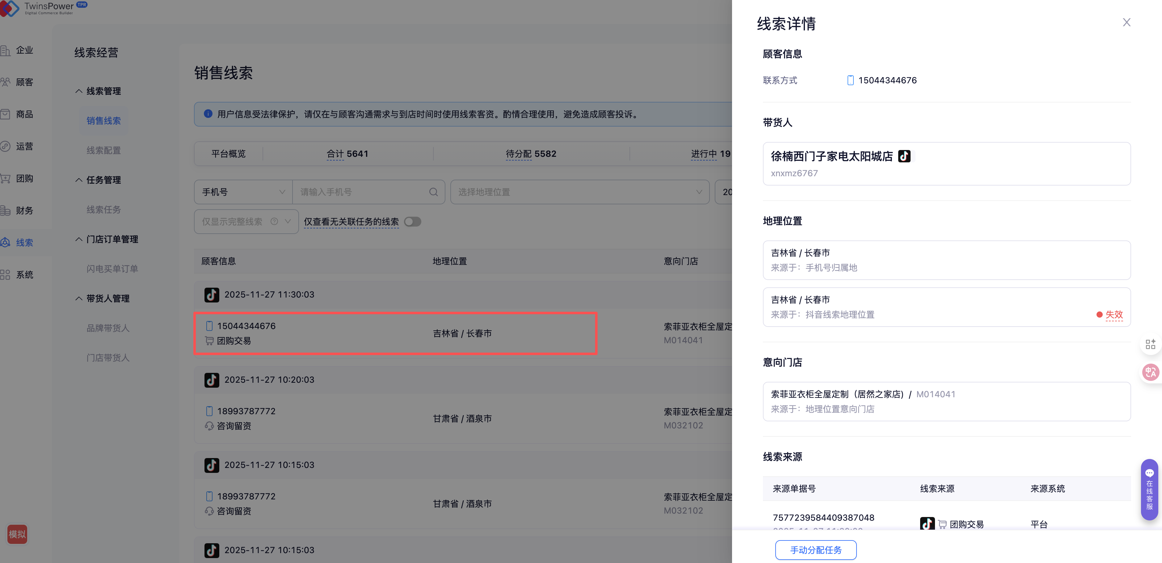 - 可点击查看单个线索详情,含顾客信息、带货人、顾客地理位置、意向门店、线索来源、团购信息等详细记录。