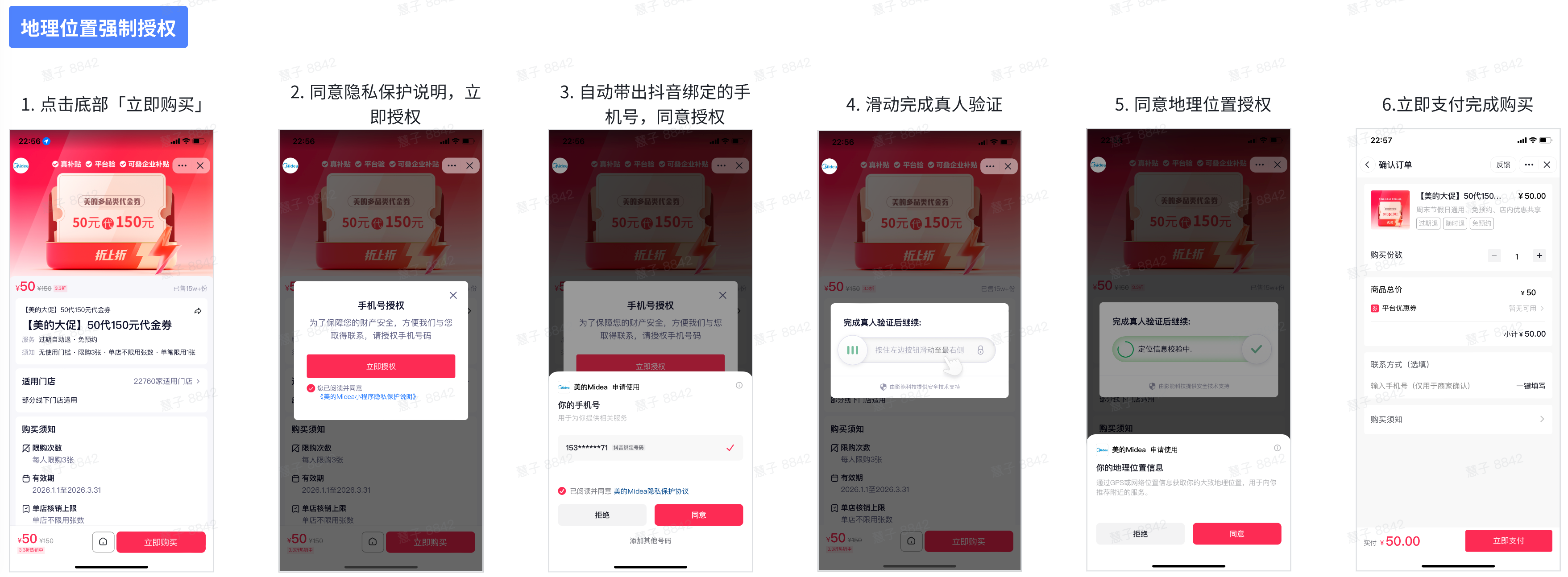 若开启【地理位置强制授权】,顾客购买商品流程如下: