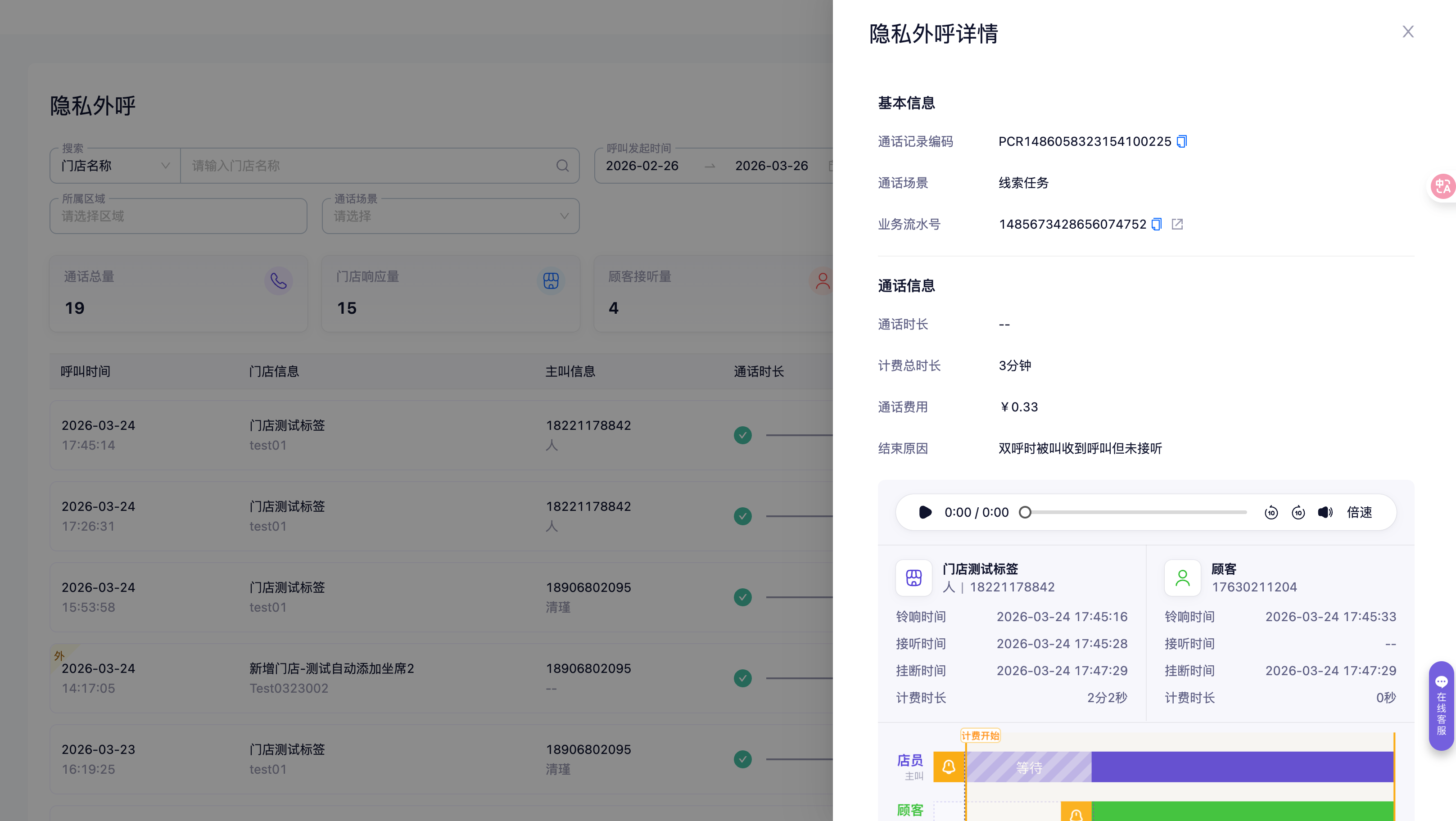 在隐私外呼记录中,可查看通话基础信息(时间、时长、接听情况等)、通话录音播放、计费详情等。