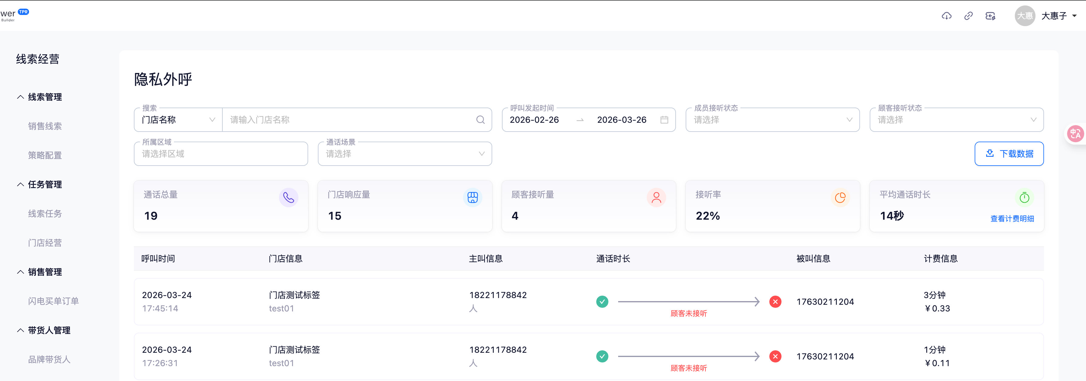 - 支持门店通过【隐私外呼】直接联系顾客,统一由总部承担通信费用