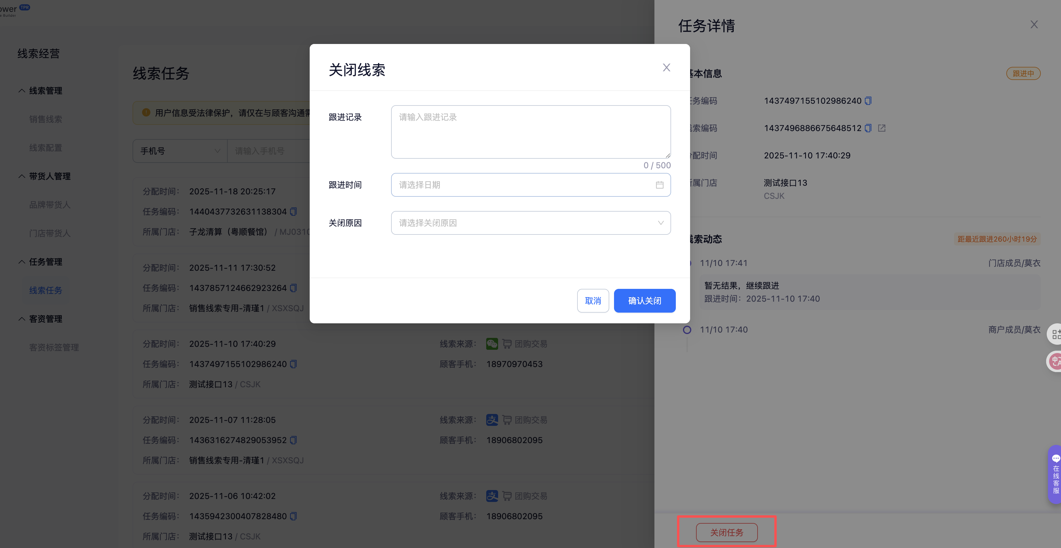 若顾客明确表示无意向或其他原因需关闭任务,除店员可在商管云关闭任务外,商管后台也可以关闭任务。关闭后线索状态则为已失效。
