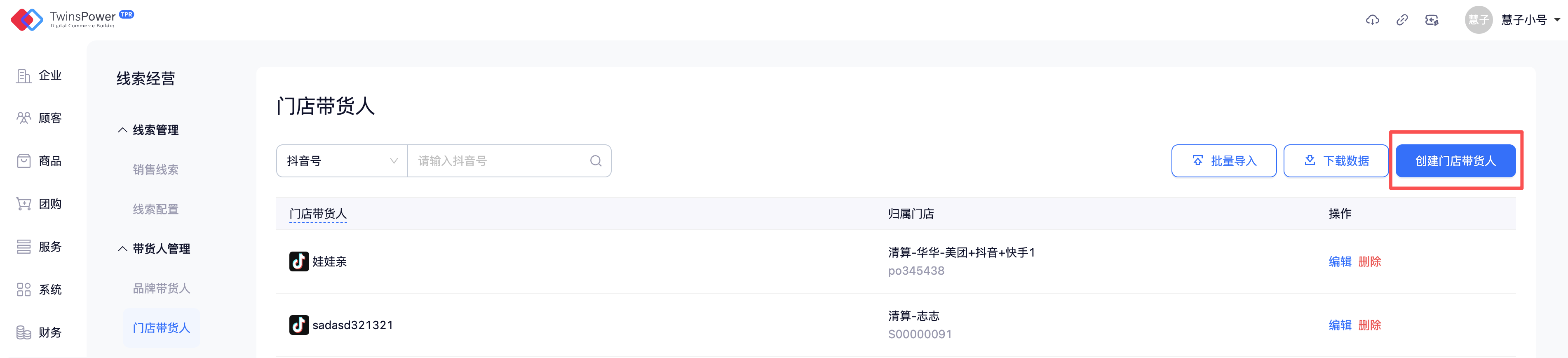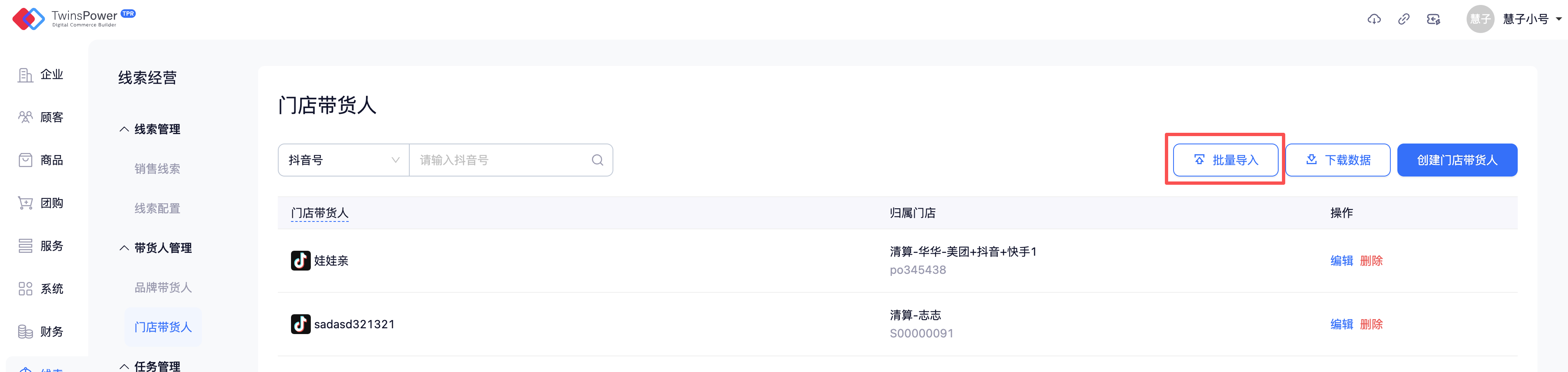 💡门店带货人即门店店员,一个门店带货人仅可归属于一家门店。在线索任务的分配中,若线索中含有带货人,通常带货人所属门店会是任务最高优的分配对象,所以完善门店带货人信息至关重要。