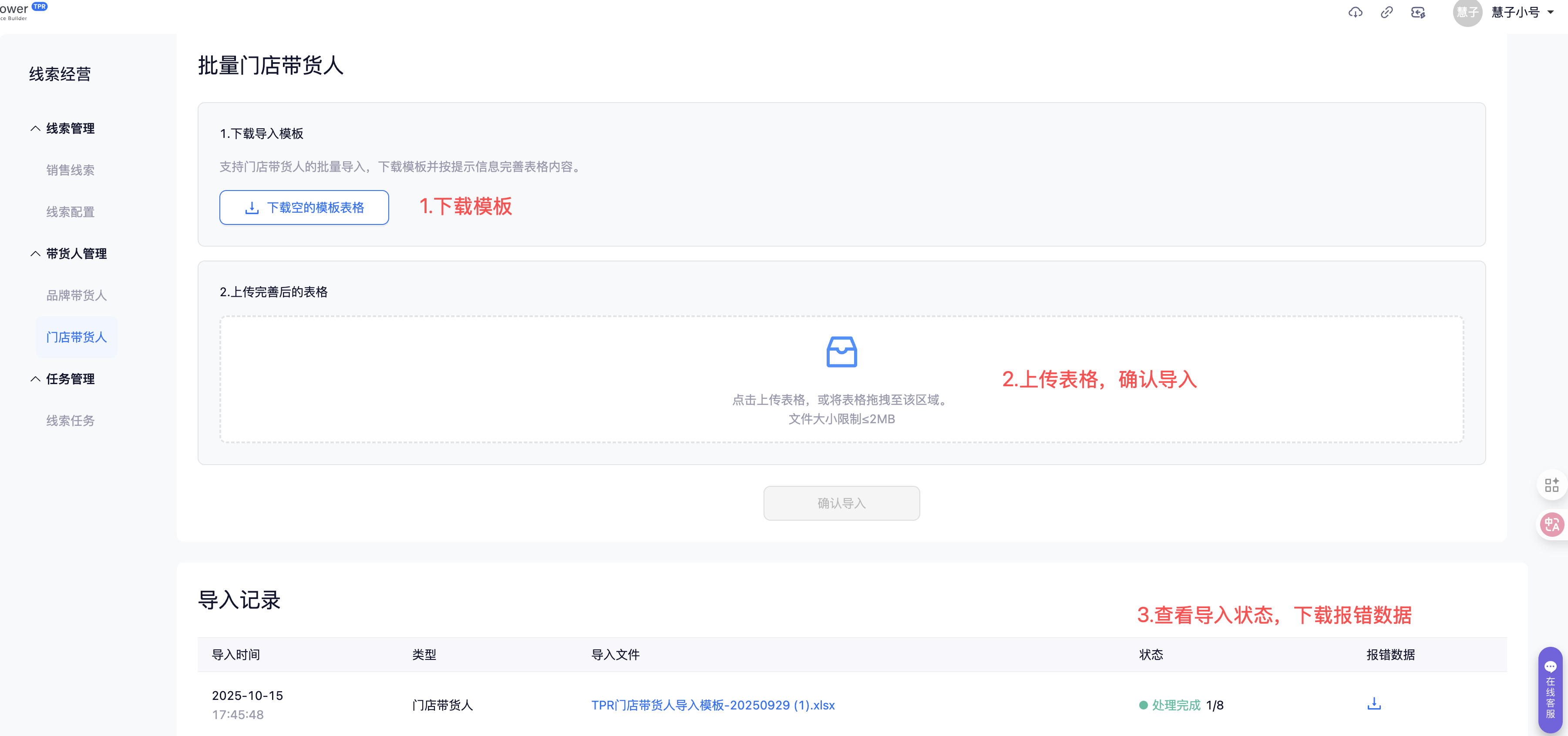 - 带货人管理:录入带货人信息,用于线索任务的精细化分配