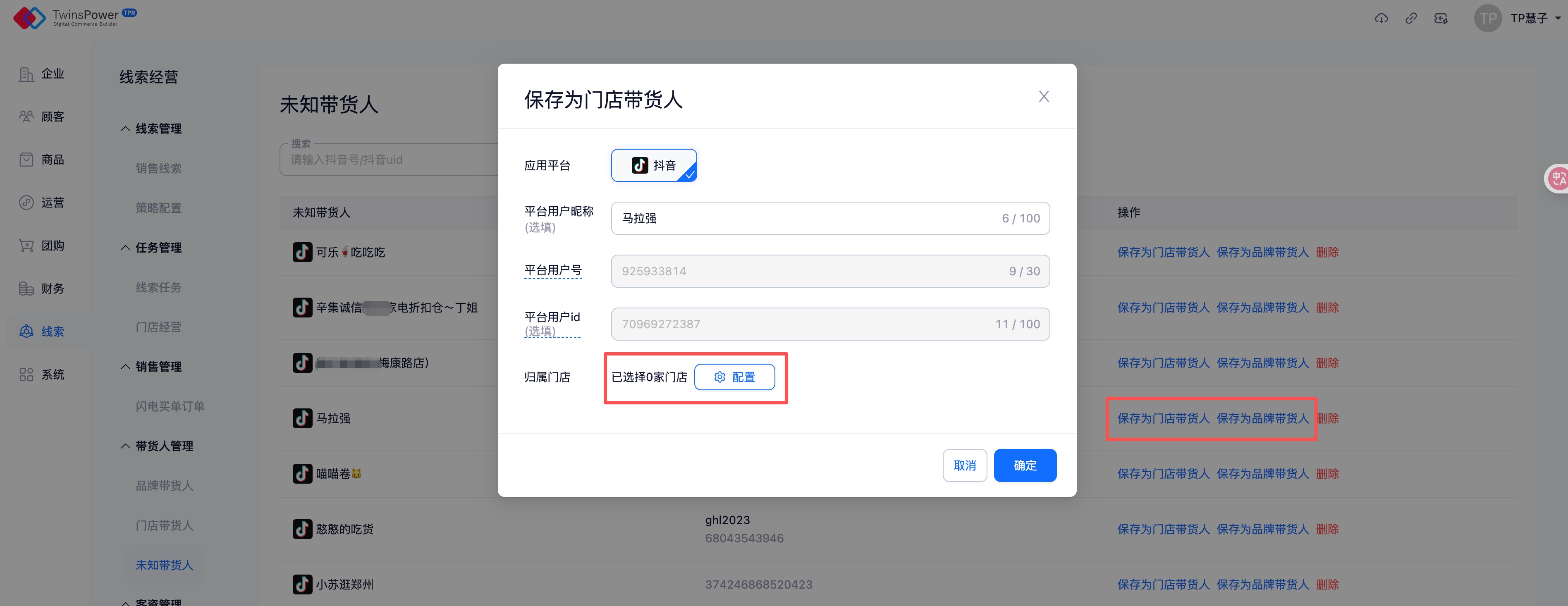 当影能通过读取来客原生线索时识别到线索中含有带货人信息时,则会保存为未知带货人。品牌运营者可在此处将未知带货人转为门店或品牌带货人。