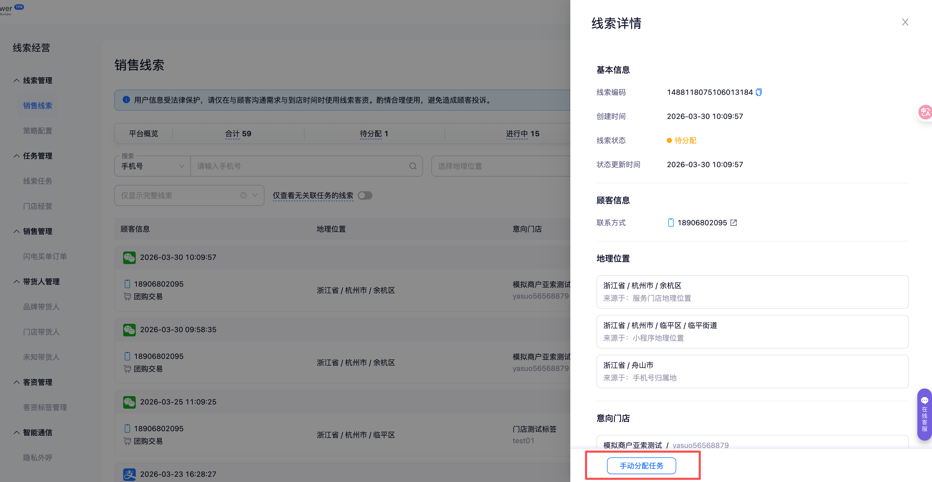 - 当线索因为缺失信息而未分配时,也可手动分配线索至指定门店任务