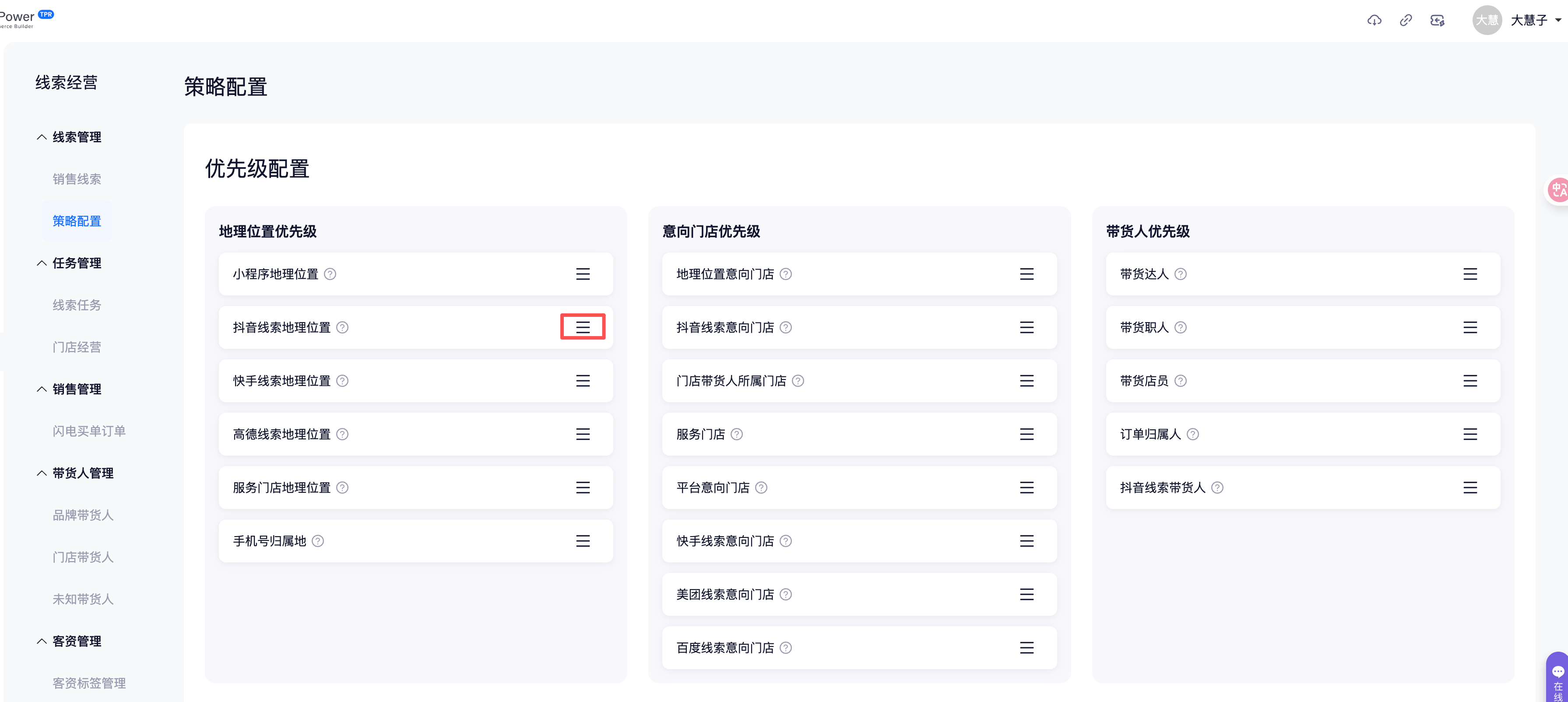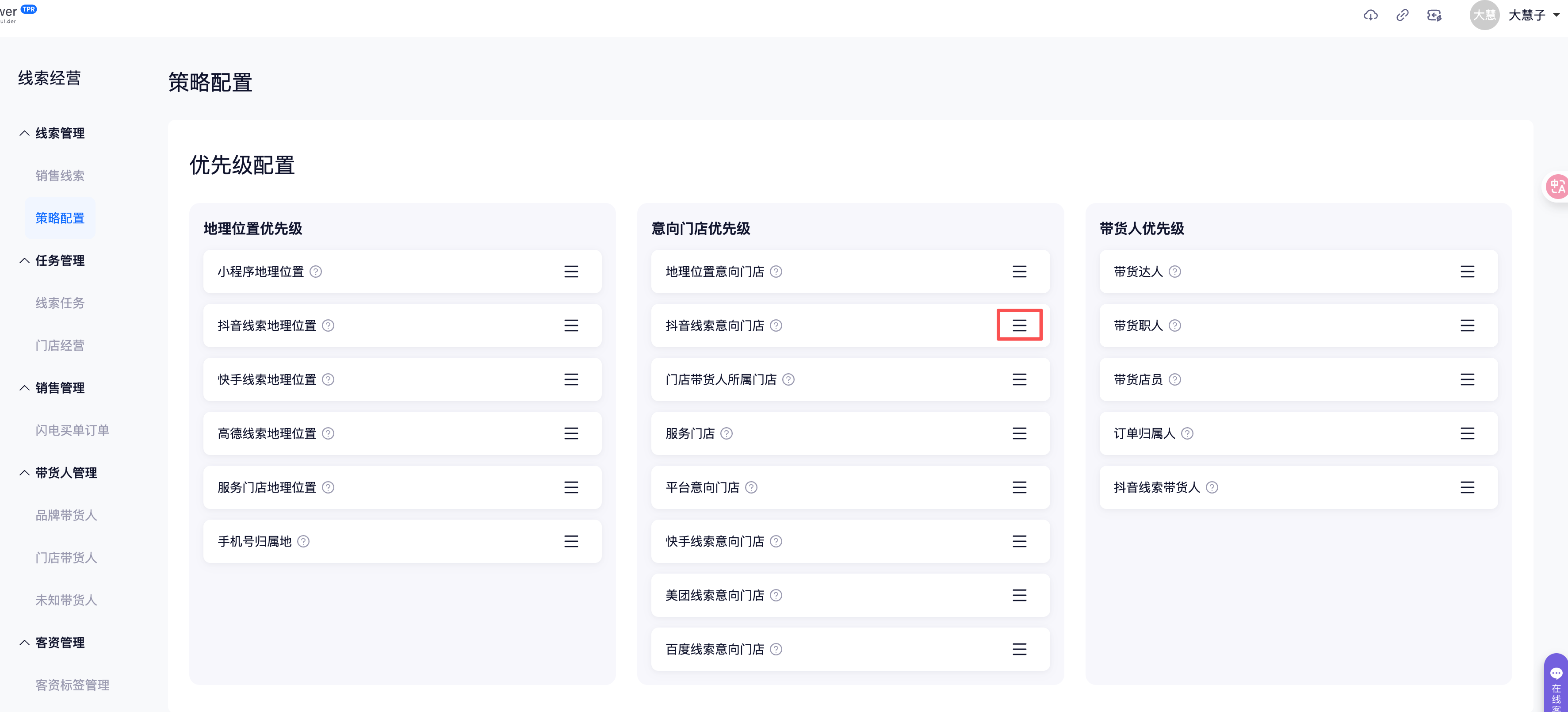 用于判断销售线索的意向门店优先级,排序越高则优先级越高。可点击图标拖拽修改门店优先级。线索会自动分配给意向门店最高的店铺。