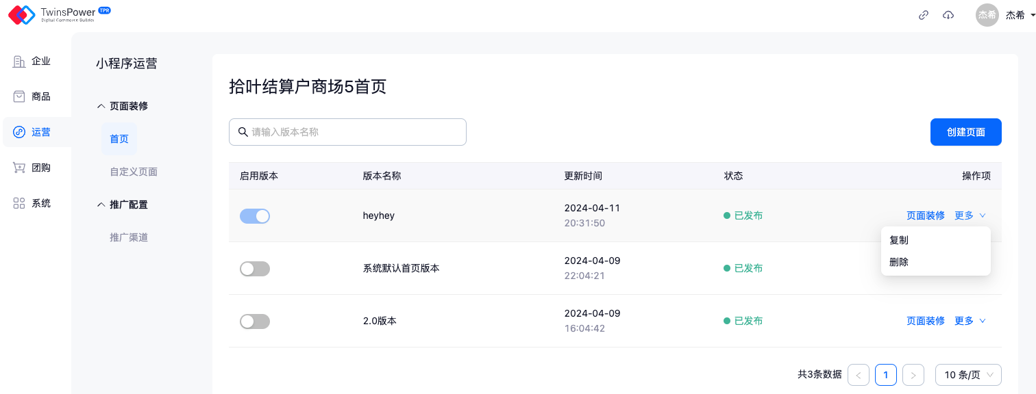 - 系统在初始化环节中会自动创建一个标准小程序首页版本,并默认开启状态。