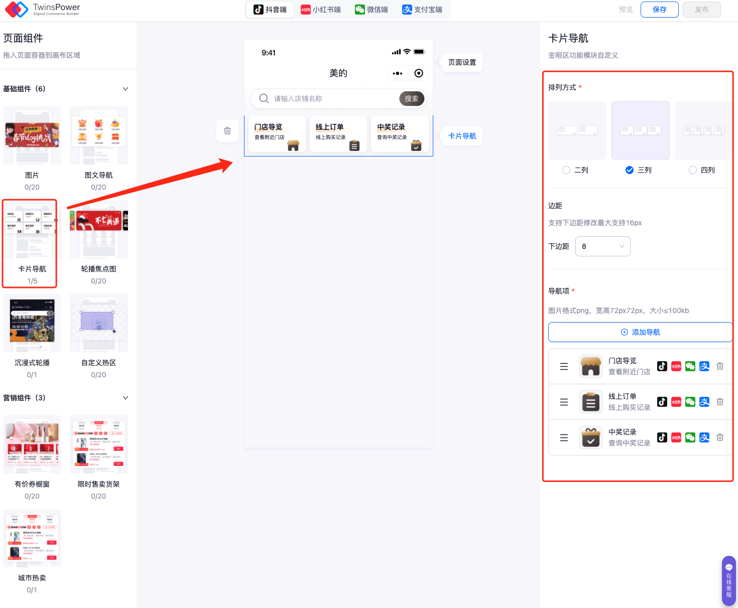 - 在左边页面组件中将卡片导航拖拽至小程序页面的适当位置,选中卡片导航之后会在右侧出现设置栏;