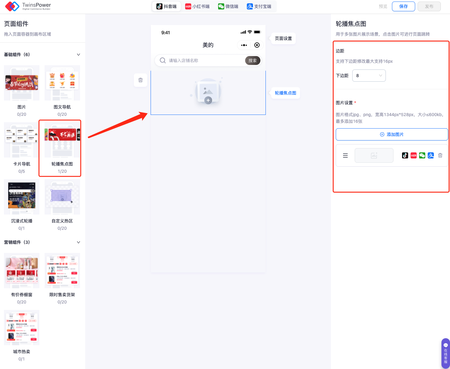 - 进入装修页面,可以根据需要对小程序的首页进行设置,支持支付宝、小红书、抖音和微信小程序分开设置