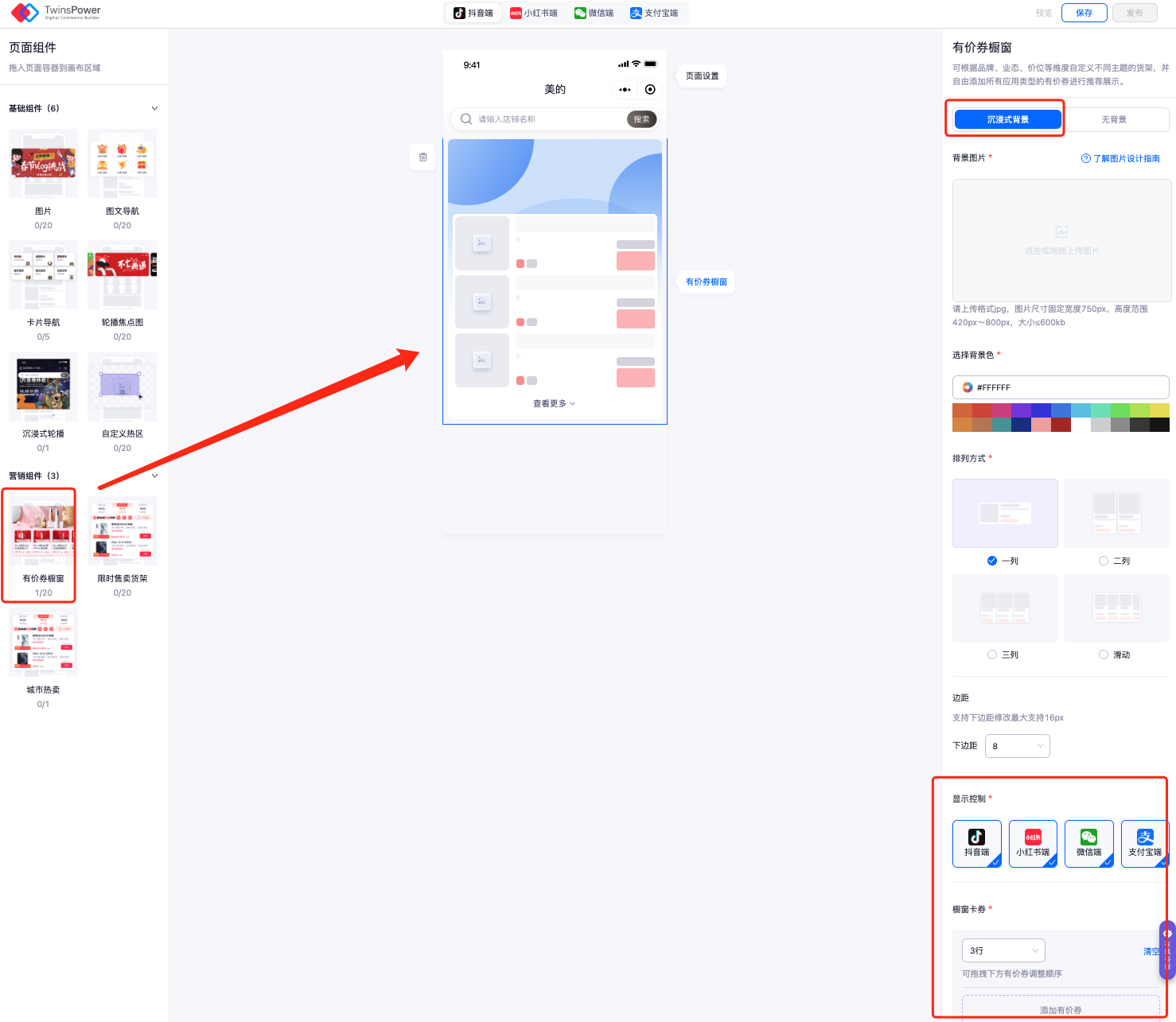 - 有价券橱窗组件支持沉浸式背景模式,如同一品牌券,可设置沉浸式背景打造品牌氛围