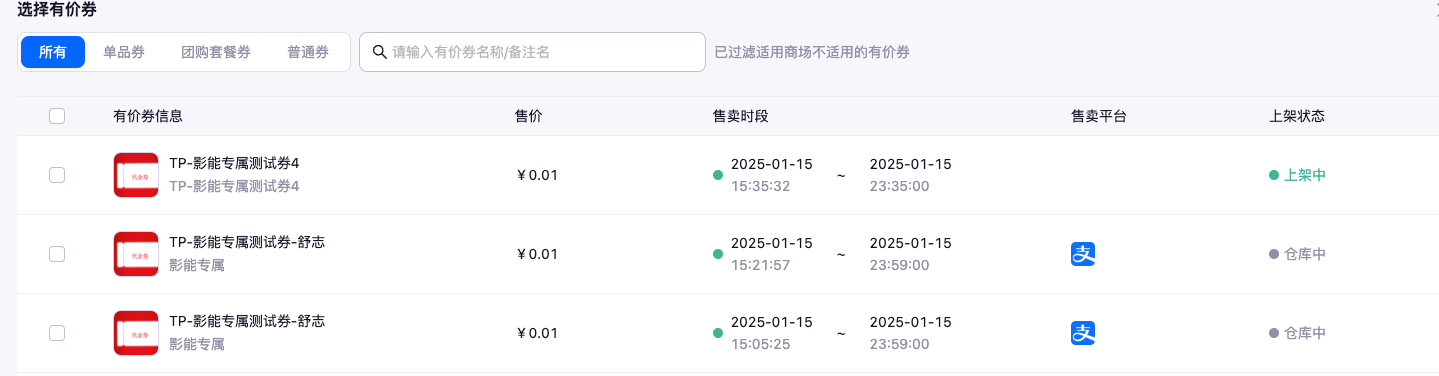 - 最后点击「添加有价券」,在有价券列表中选择要展示的有价券,可选择不同售卖时间的有价券