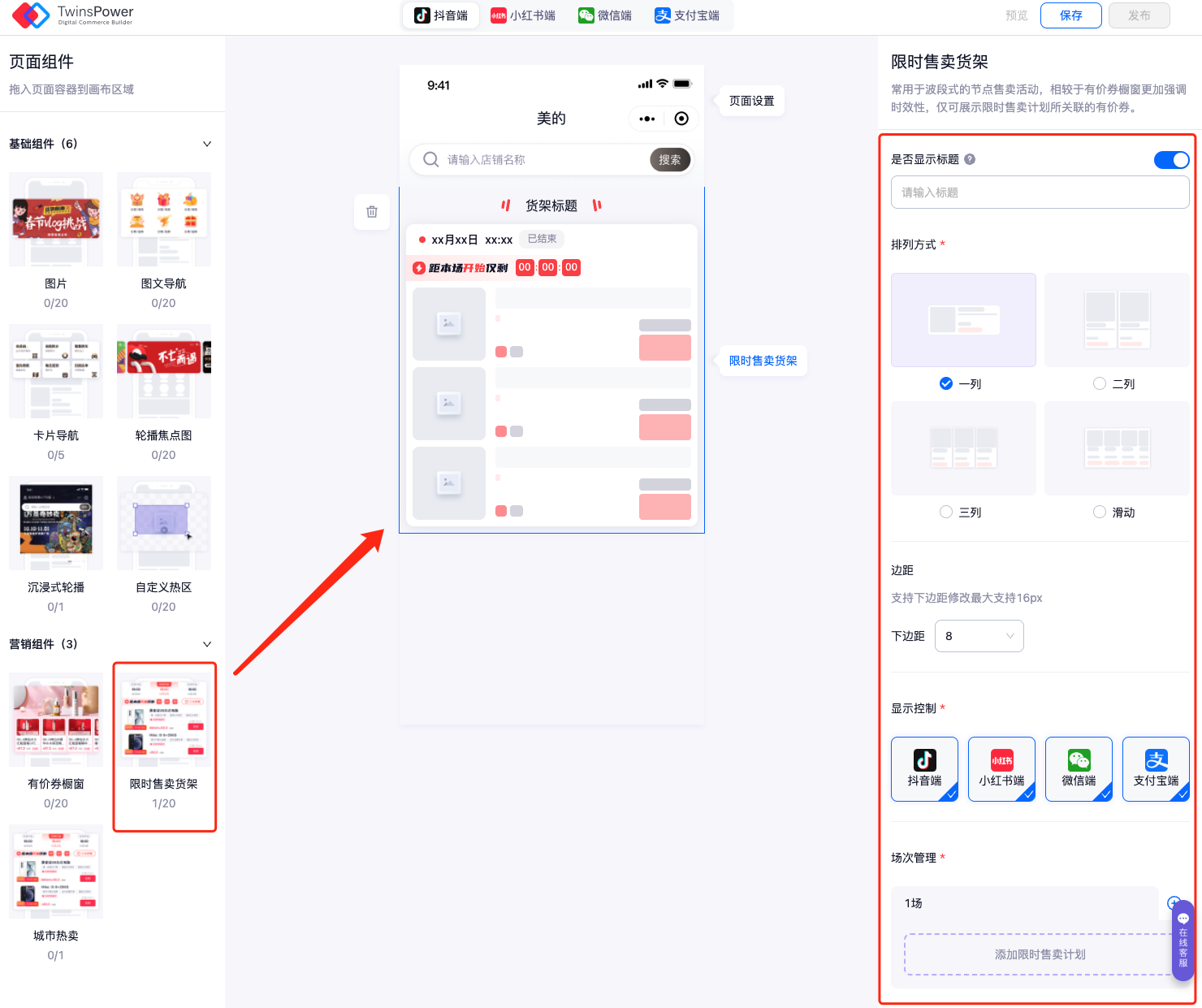 - 将限时售卖货架组件拖拽至页面画布中,点击一下画布中的该组件,进行组件信息设置