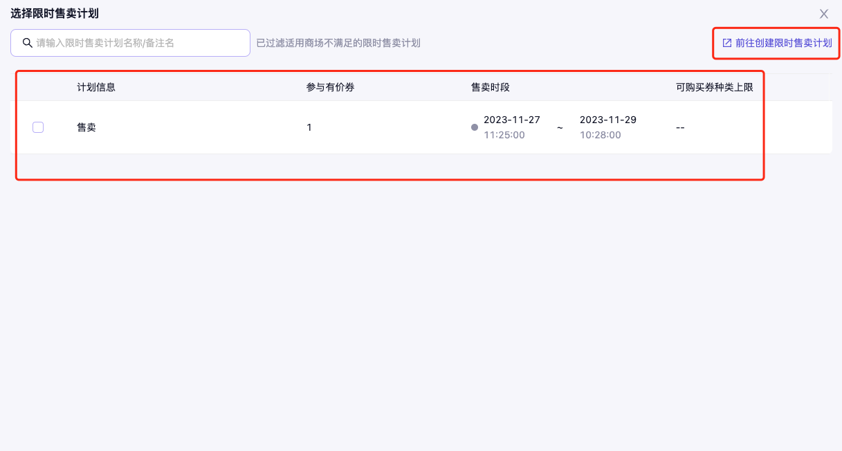 - 添加限时售卖计划,进入限时售卖计划列表中添加所需的计划,如果没有所需要的,可点击「前往创建限时售卖计划」