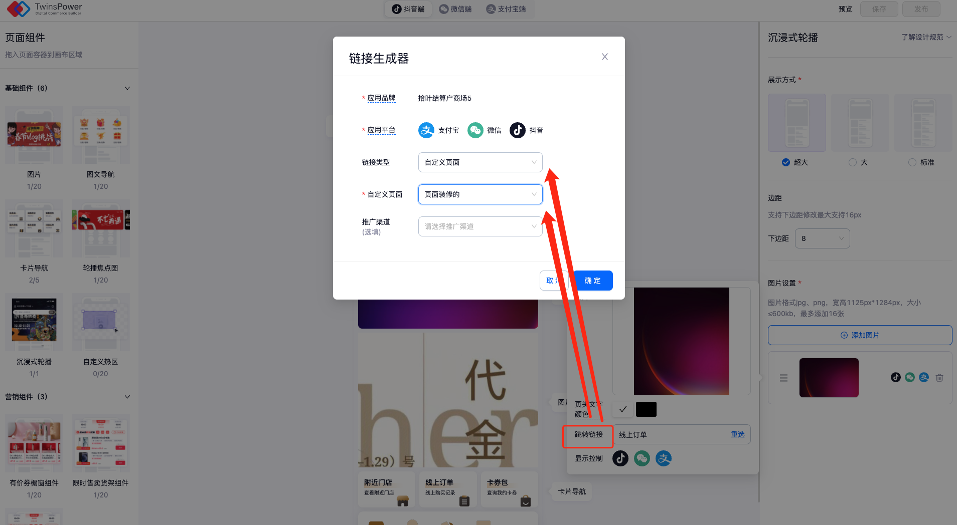 在首页装修中,沉浸式轮播图中设置跳转链接,链接类型选择自定义页面,选择自定义页面名称,保存发布后,顾客即可通过点击该轮播图跳转至自定义页面中。