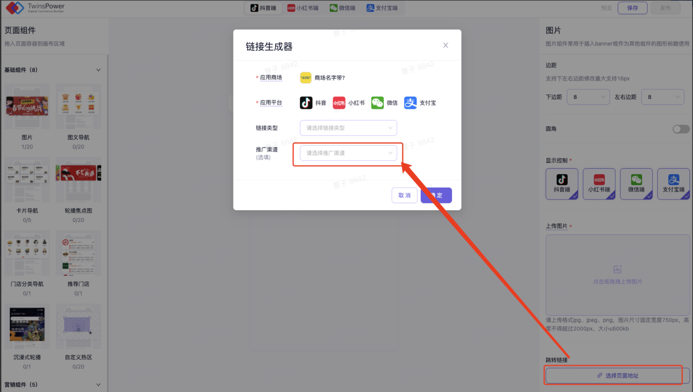 在页面装修中,使用基础组件配置跳转链接时,可添加推广渠道,从而获取相应数据。