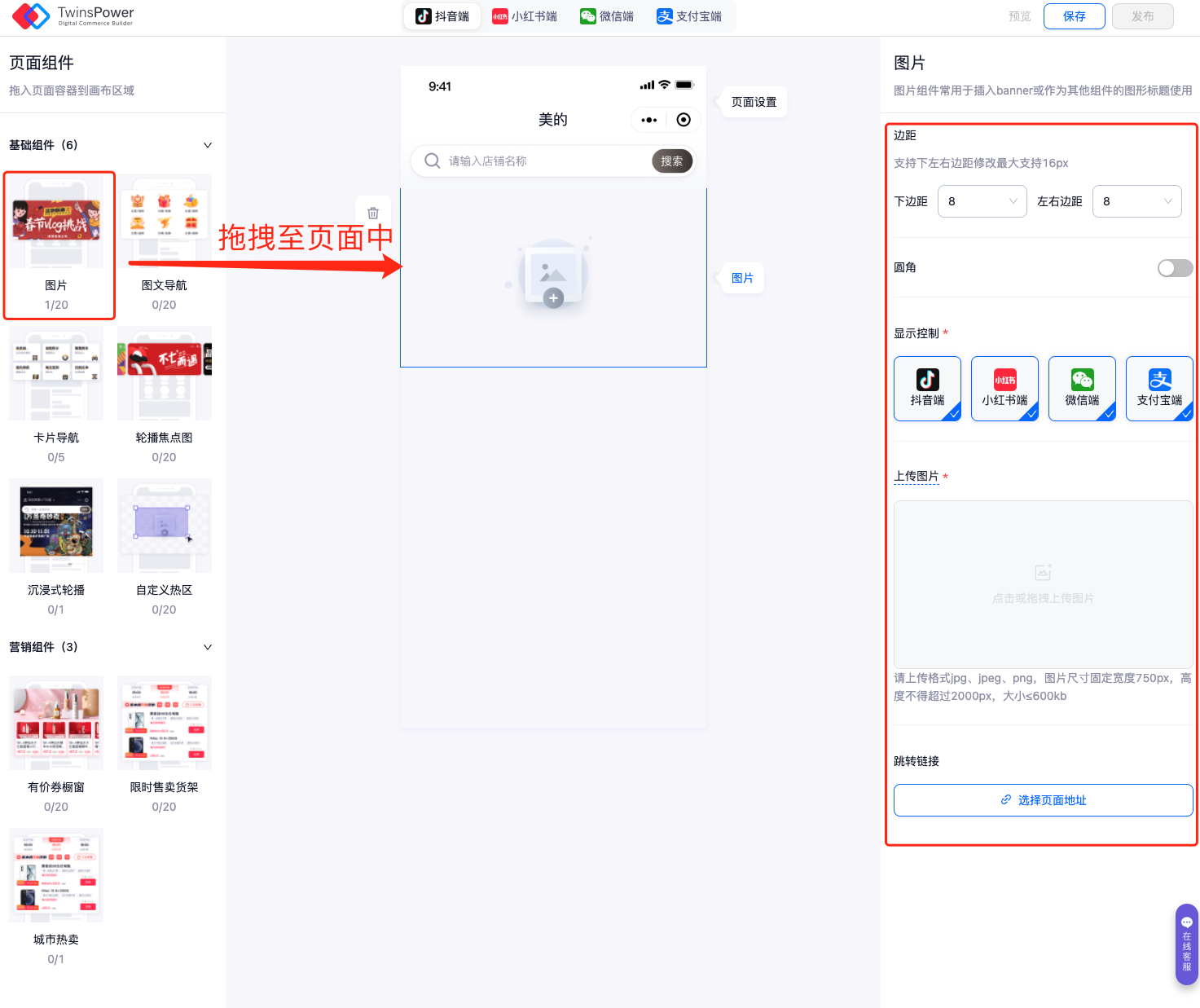 首先添加一个“图片”组件,选中图片后拖拽到页面的合适位置即可。