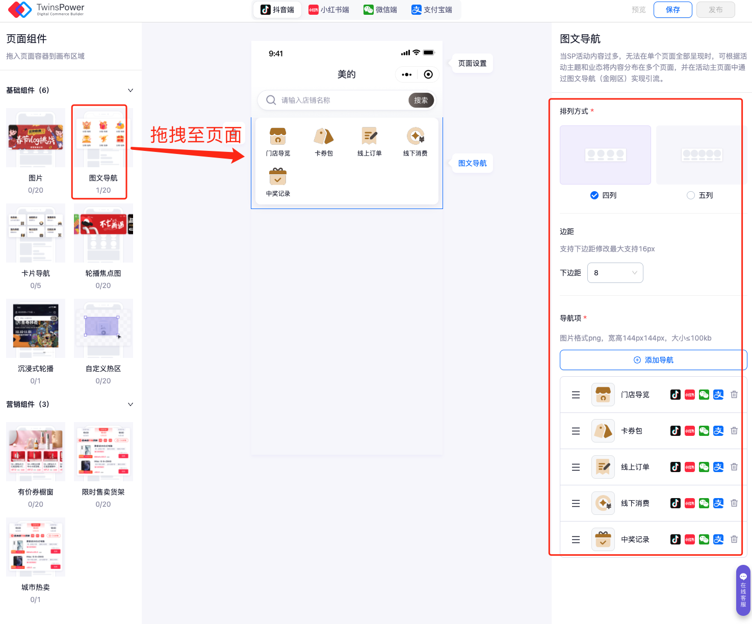 - 在左边页面组件中将图文导航拖拽至小程序页面的适当位置,选中图文导航之后会在右侧出现设置栏;