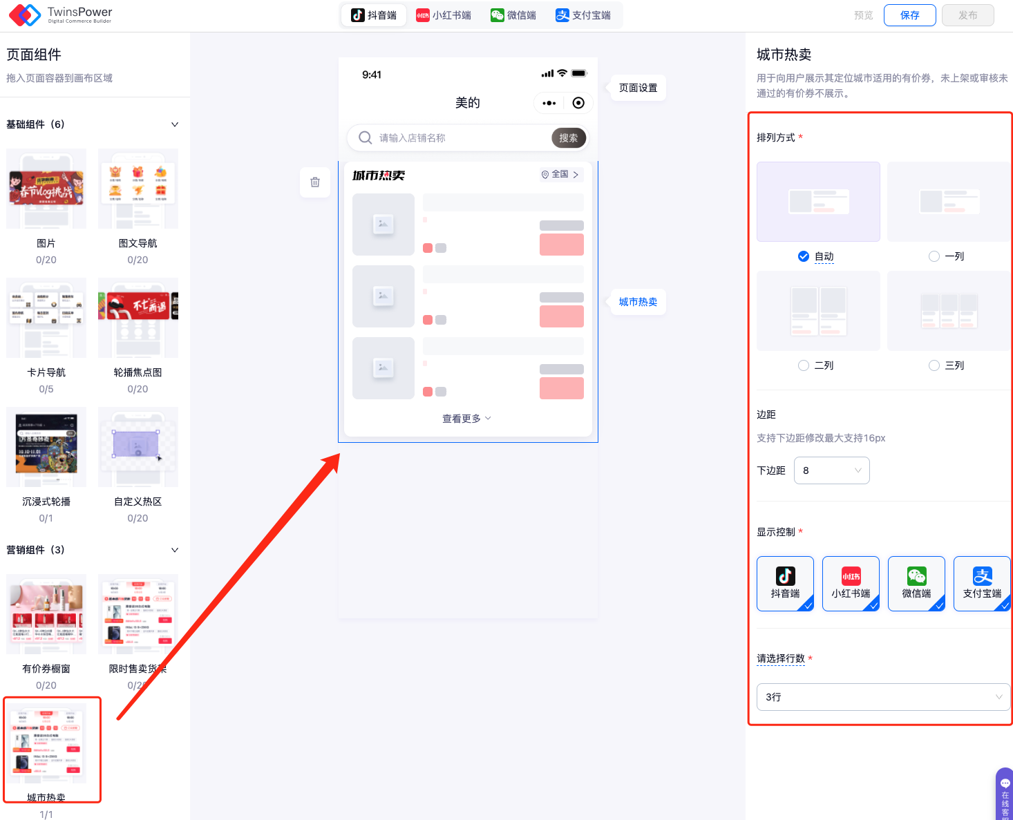 - 将城市热卖组件拖拽至页面画布中,点击一下画布中的该组件,进行组件信息设置