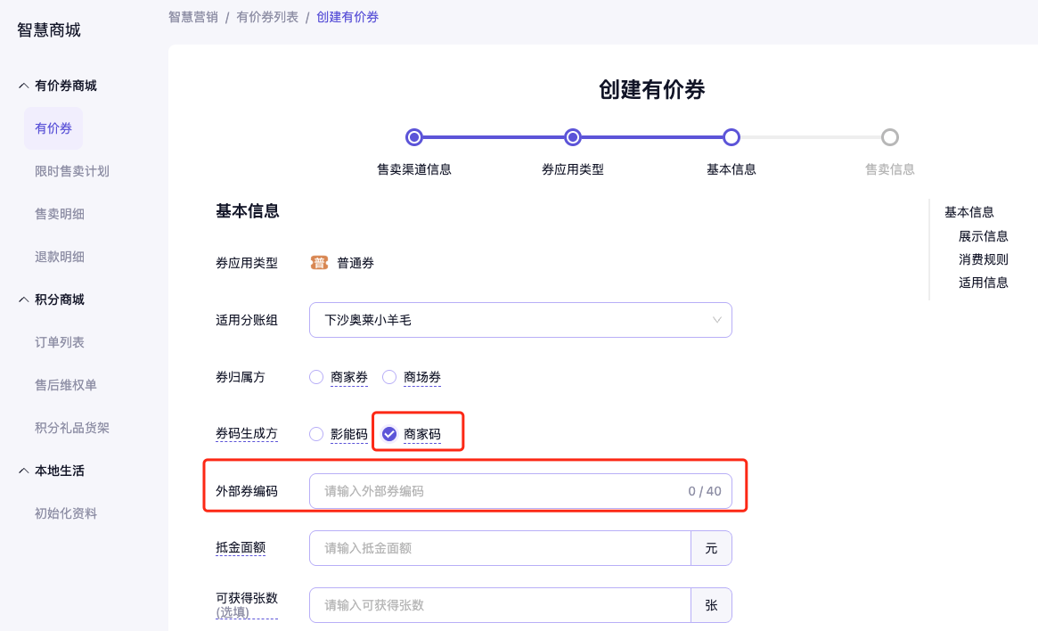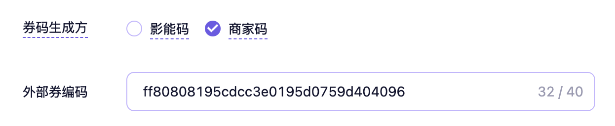 选择完「商家码」后,在外部编码中填写商家侧平台对应卡券编号