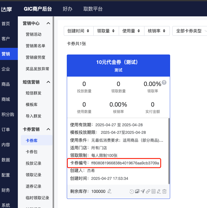 需要先在GIC侧将对应的卡券创建出来,其中GIC侧创建券时需注意以下几点: