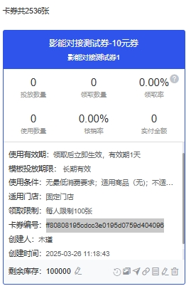 | 注意事项 | 先达摩侧创建卡券 | 后在影能侧创建有价券/营销券 |