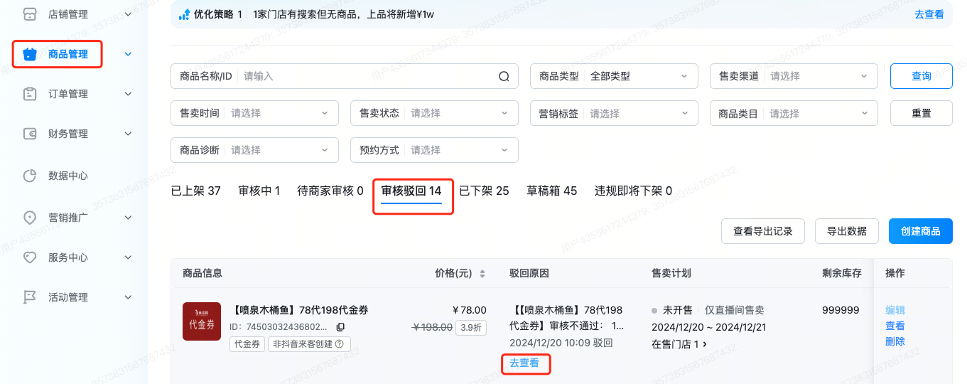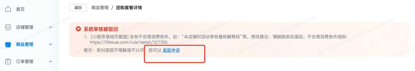- 审核进度及结果有异议:抖音端售卖的券,最终是由来客进行审核,影能侧只是同步审核结果。若对审核结果有疑问,可以在来客后台-商品发布-审核驳回中找到有疑问的券,在被驳回原因中点击去查看申诉,即可咨询具体被驳回的原因。