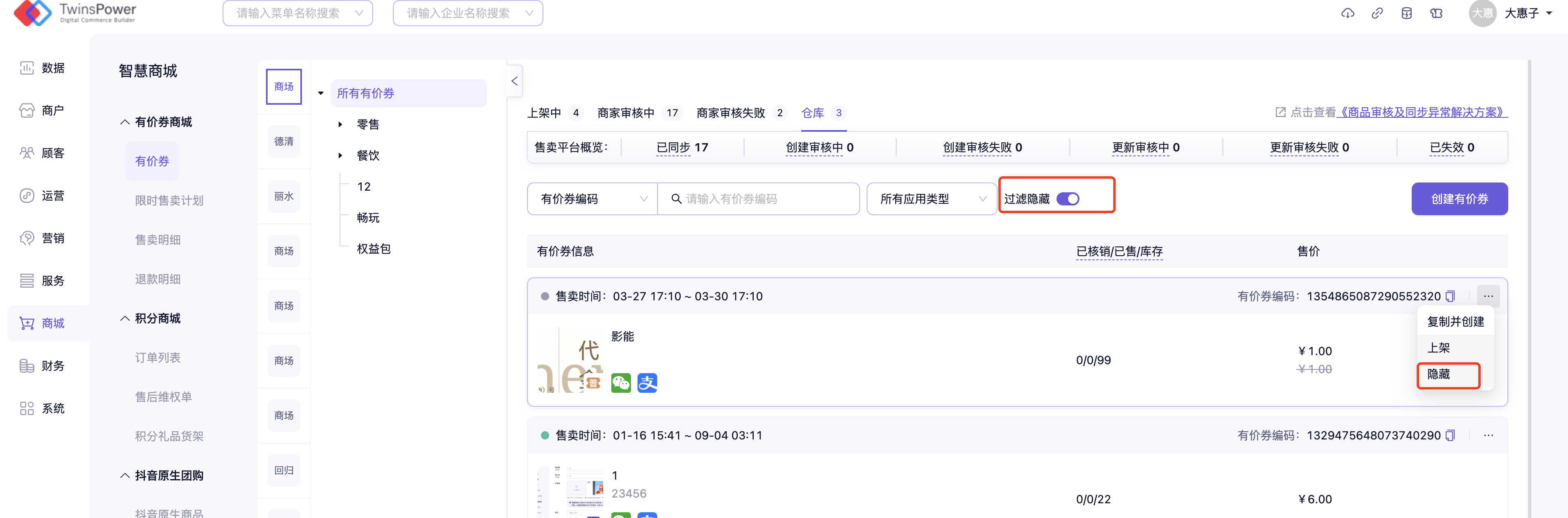 - 对于尚未投放出去的卡券,如果因为卡券相关信息设置有问题时,可以选择将其隐藏,后续在卡券列表中将不再展示