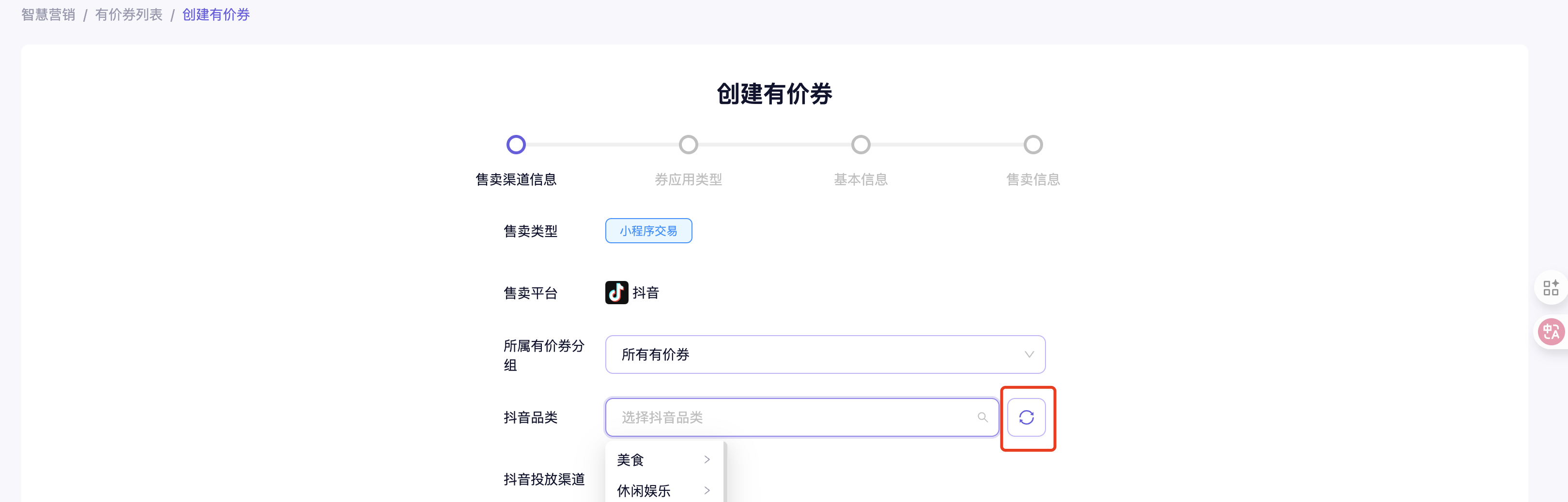 只要售卖渠道包含了抖音,只能创建闪电买单抵金券、普通券以及权益包这三种类型券。若需上架单品券/团购套餐券,售卖渠道只能选择微信/支付宝(只有个别商管有该限制,其他商管暂无)