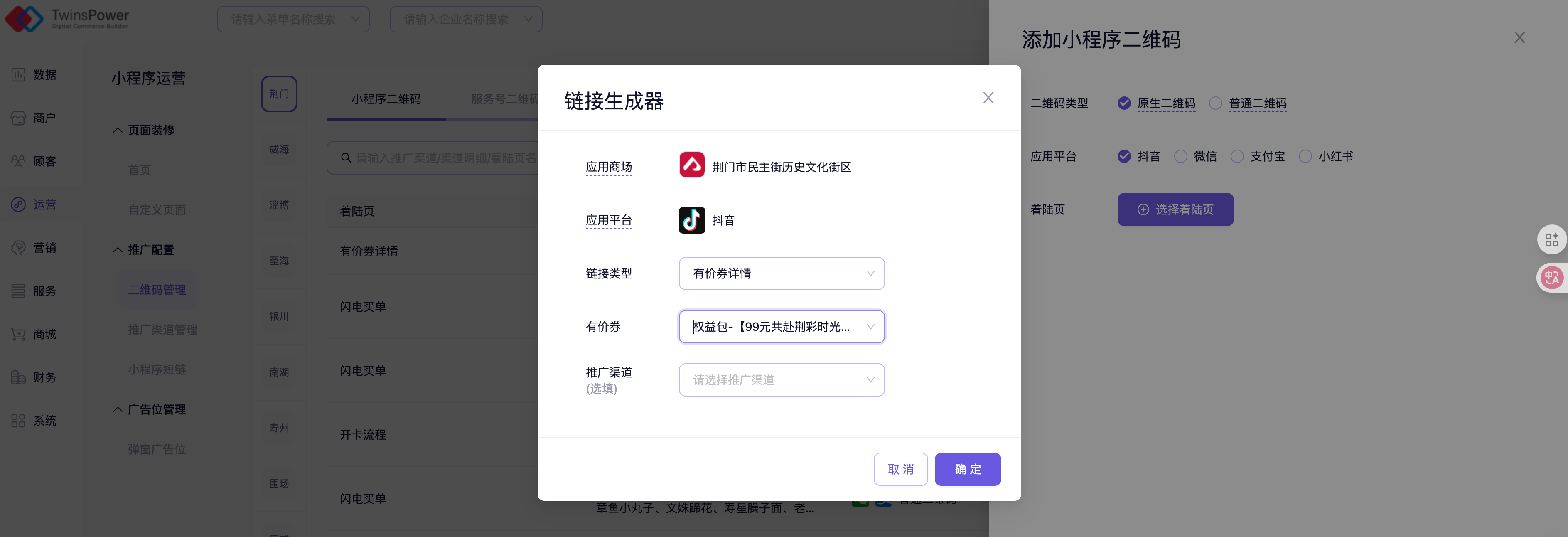创建了免费券或有价券后,可以在小程序运营——二维码管理中生成券的二维码,顾客扫码后可直接进入卡券的购买页面。