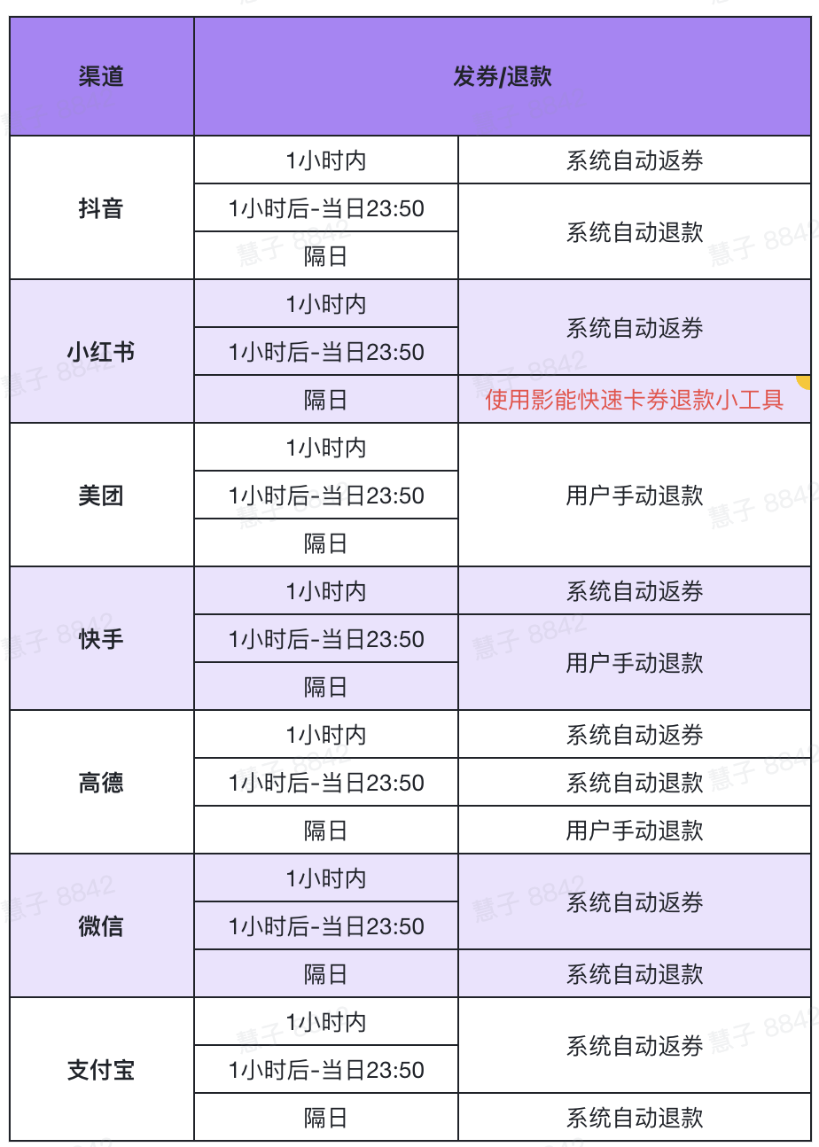 根据各平台规则限制,反核销(卡券核销后用户发起退货退单)的处理也有所差异。