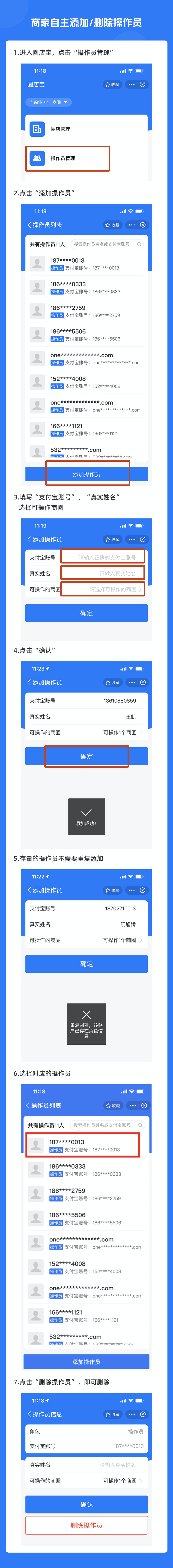 开通权限后,商家可以自主添加/删除操作员,具体步骤如下
