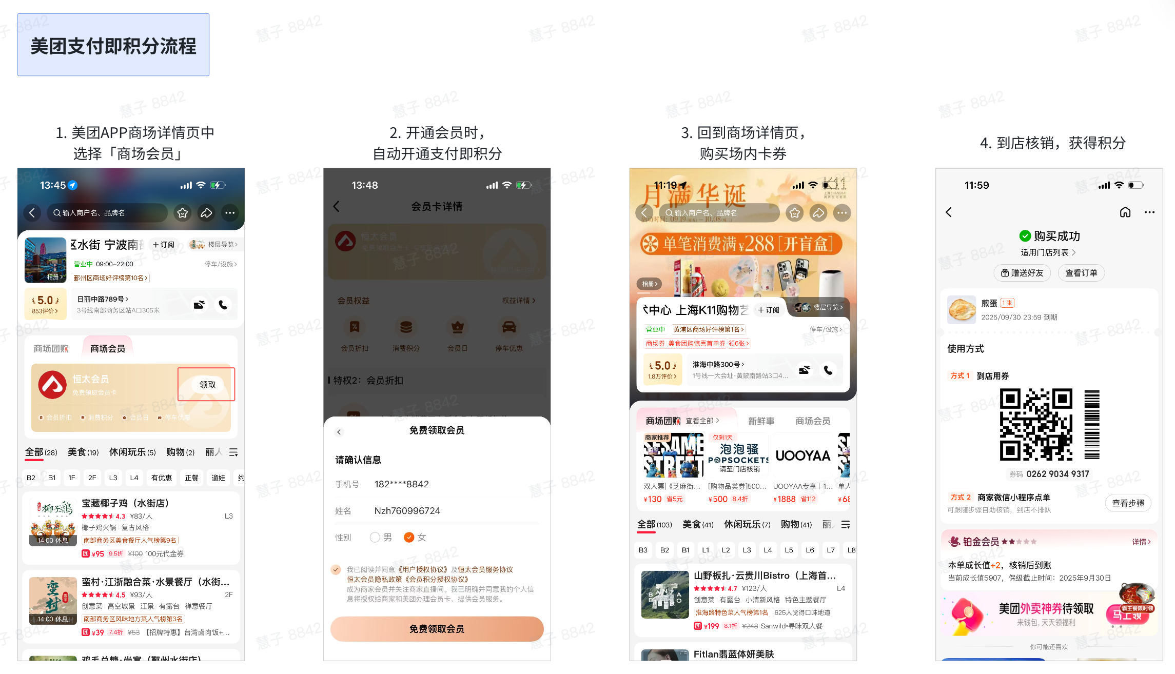 - 购买商场或场内商家的卡券,并核销后,即可获得积分。仅卡券金额可获得积分,其余如美团在线买单、美团收银机等支付无法积分。