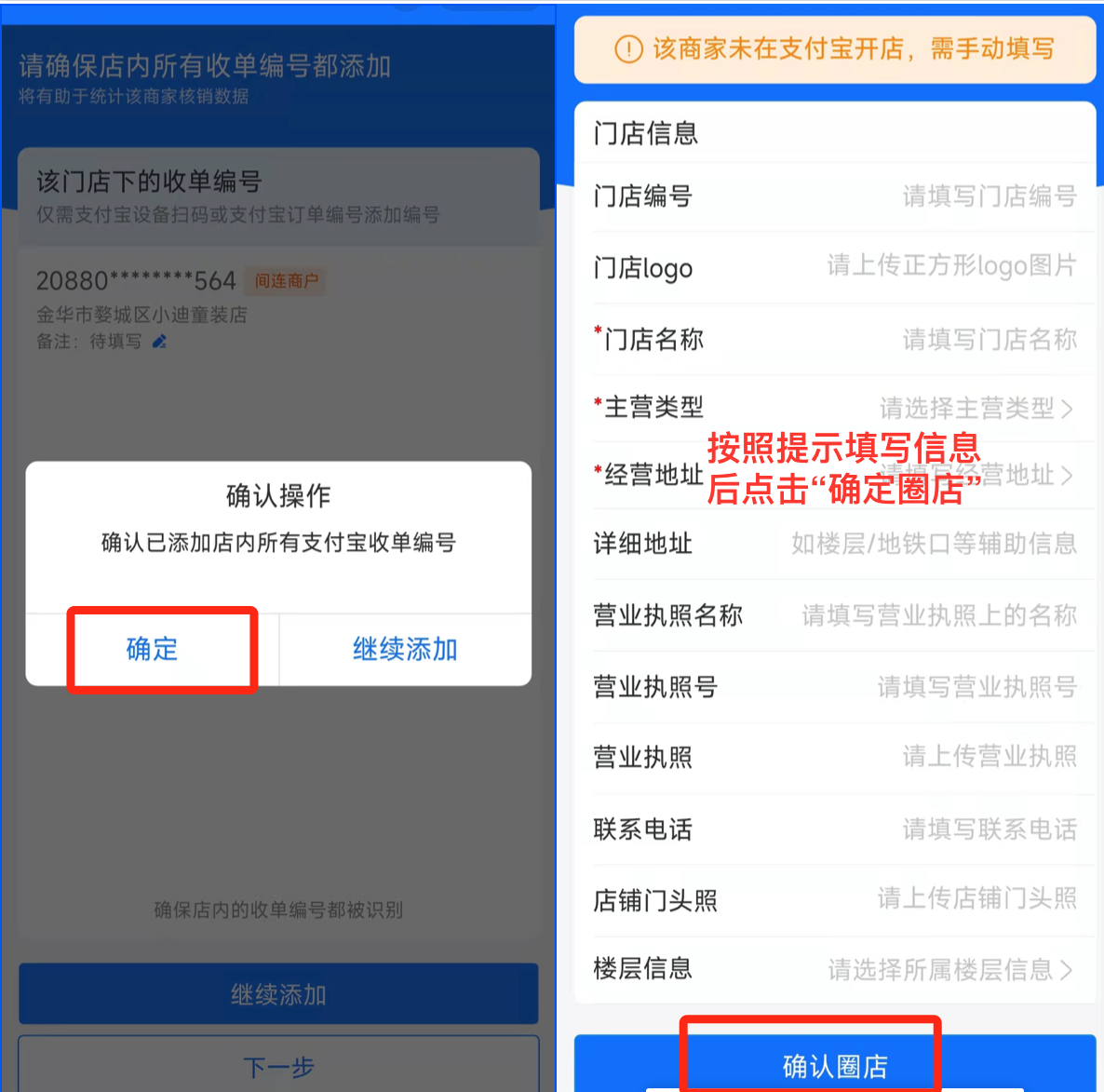 - 如果不一致:说明该支付宝账号没有被圈店,需要继续完善门店信息。