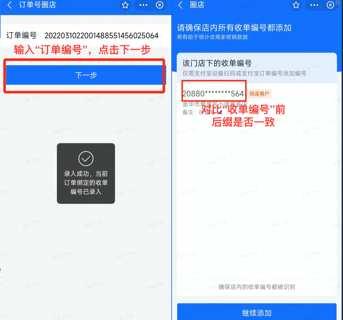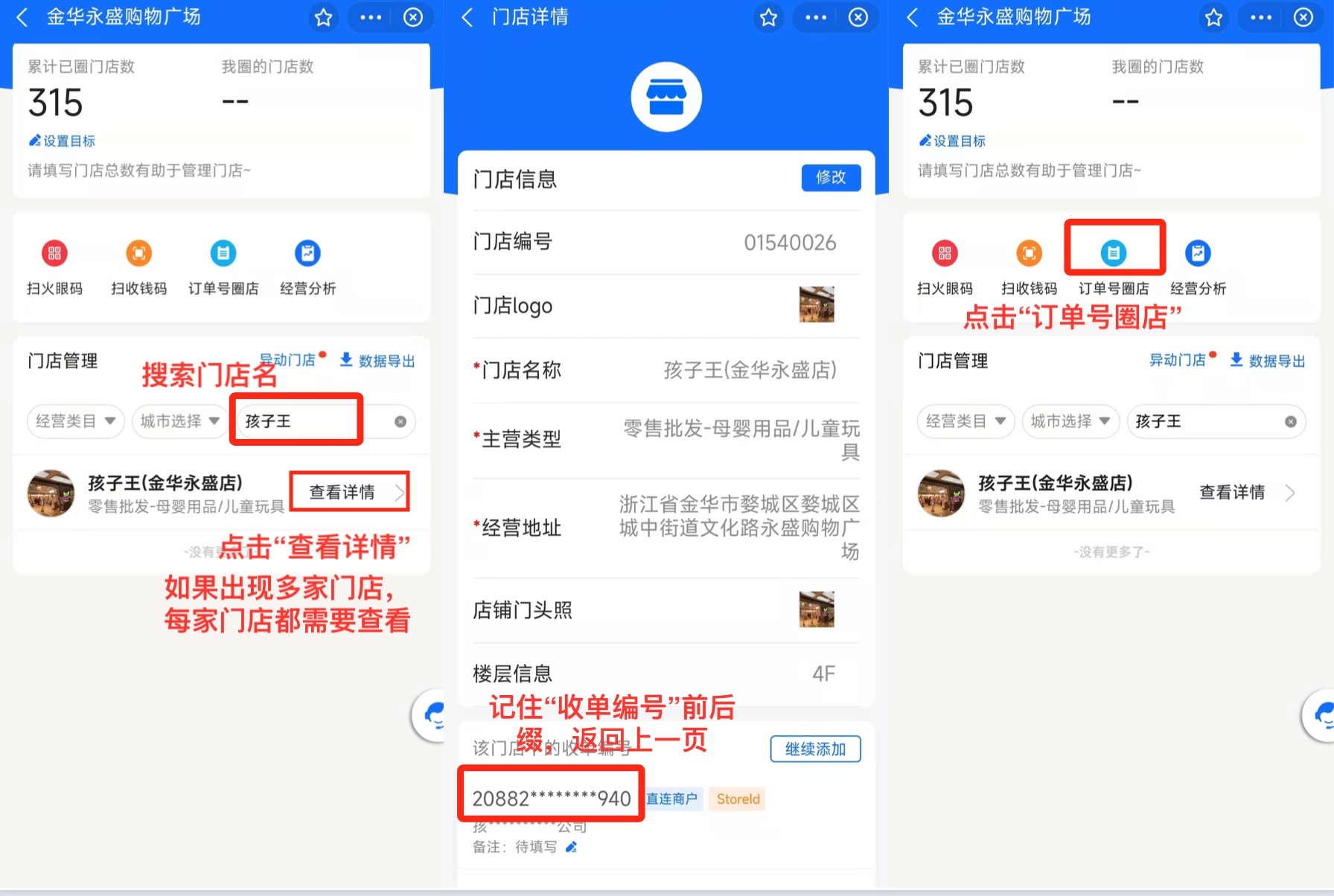 - 记住该门店的“收单编号”的前缀和后缀(如果同一个门店圈了多个支付宝账户,则需要记住多个“收单编号”);
