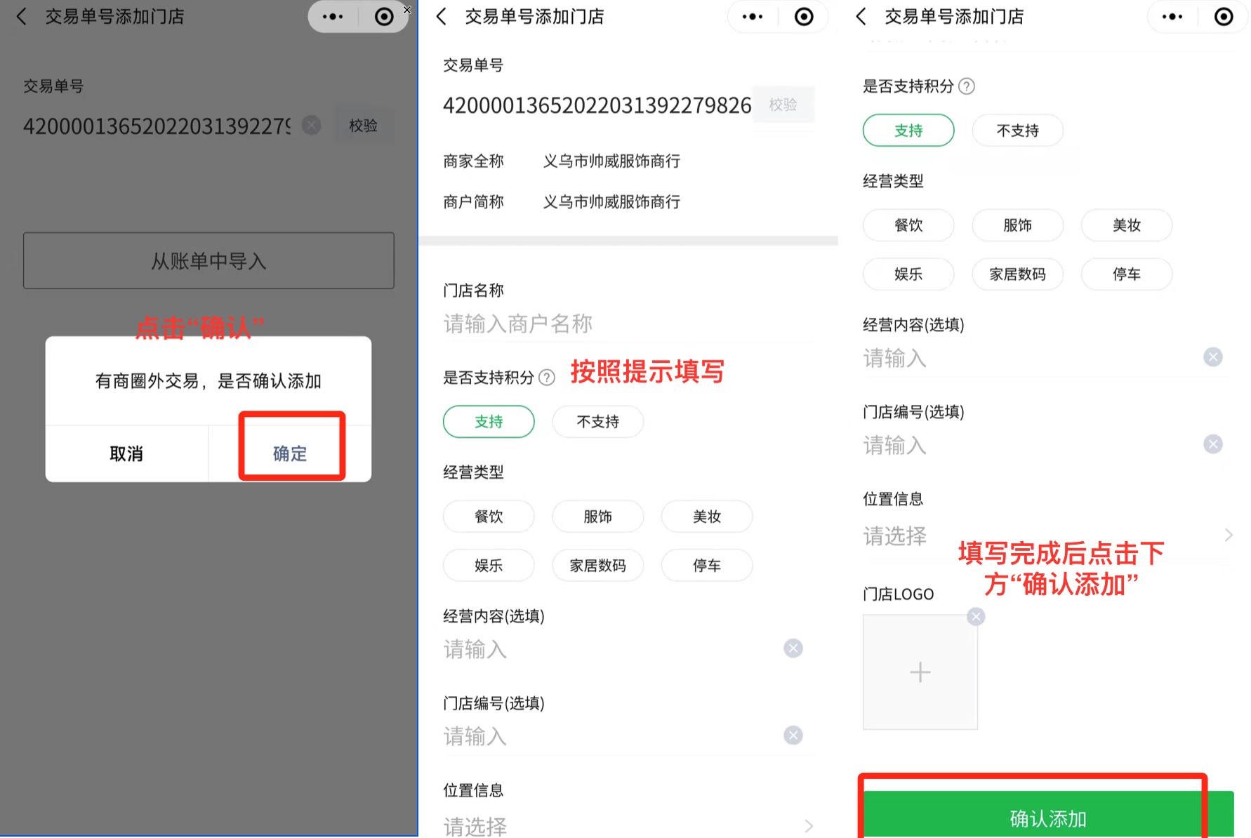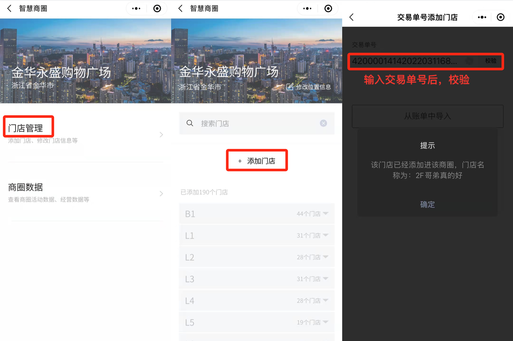 在微信中搜索打开【智慧商圈】,选择对应的商场,进入【门店管理】页面,点击“添加门店”后“添加商户号”,选择“填写交易单号”,输入支付订单号后点击“校验”