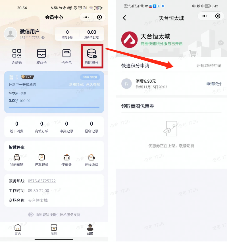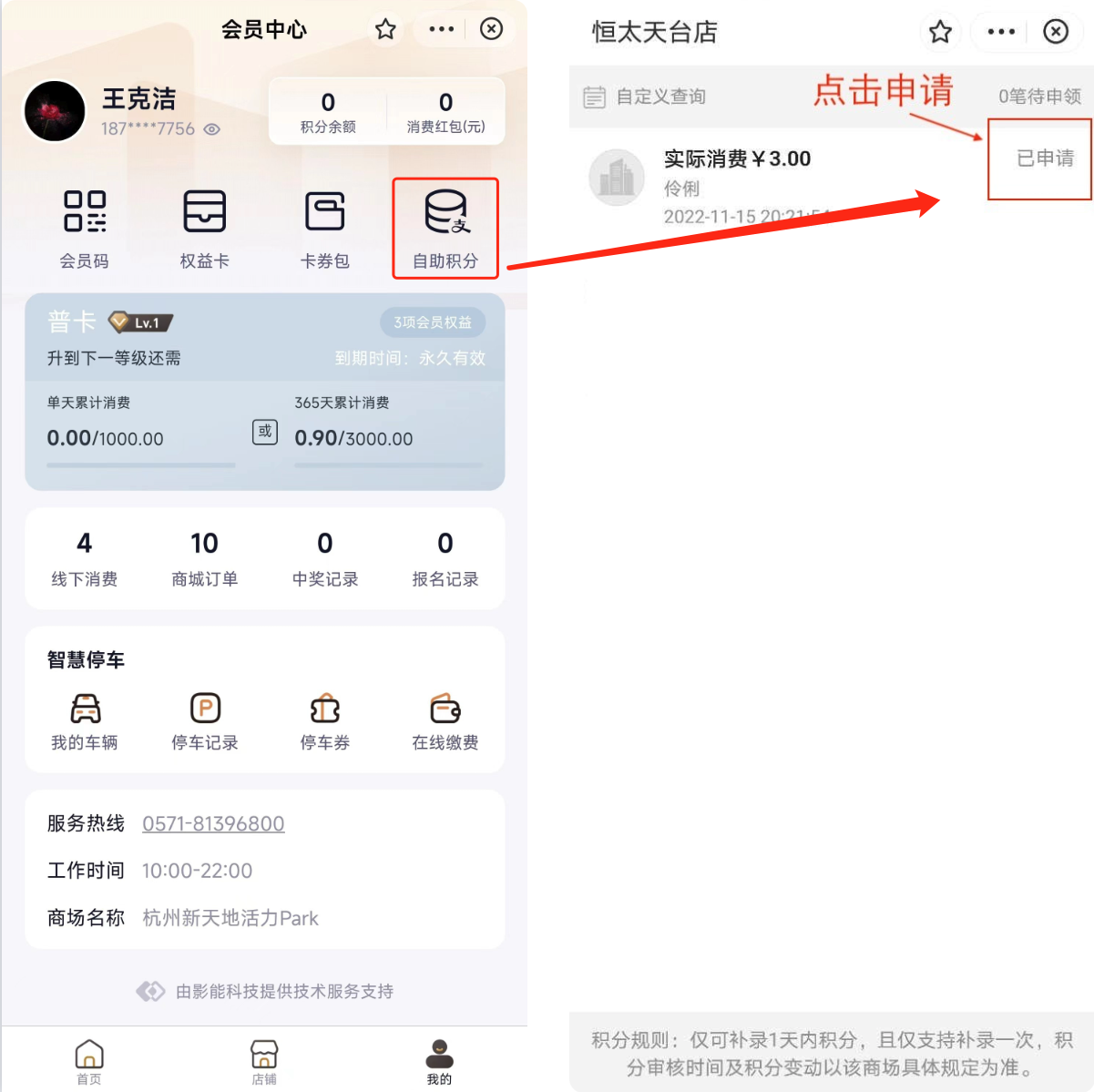 - 在使用微信支付后需要在微信小程序中的“自助积分”页面查询,使用支付宝支付后需要在支付宝小程序中的“自助积分”页面查询。对于多商场的还需要注意切换到对应的消费商场。