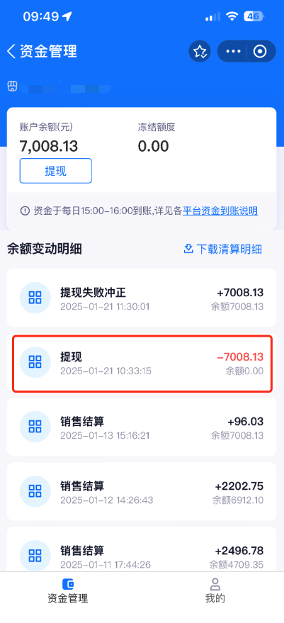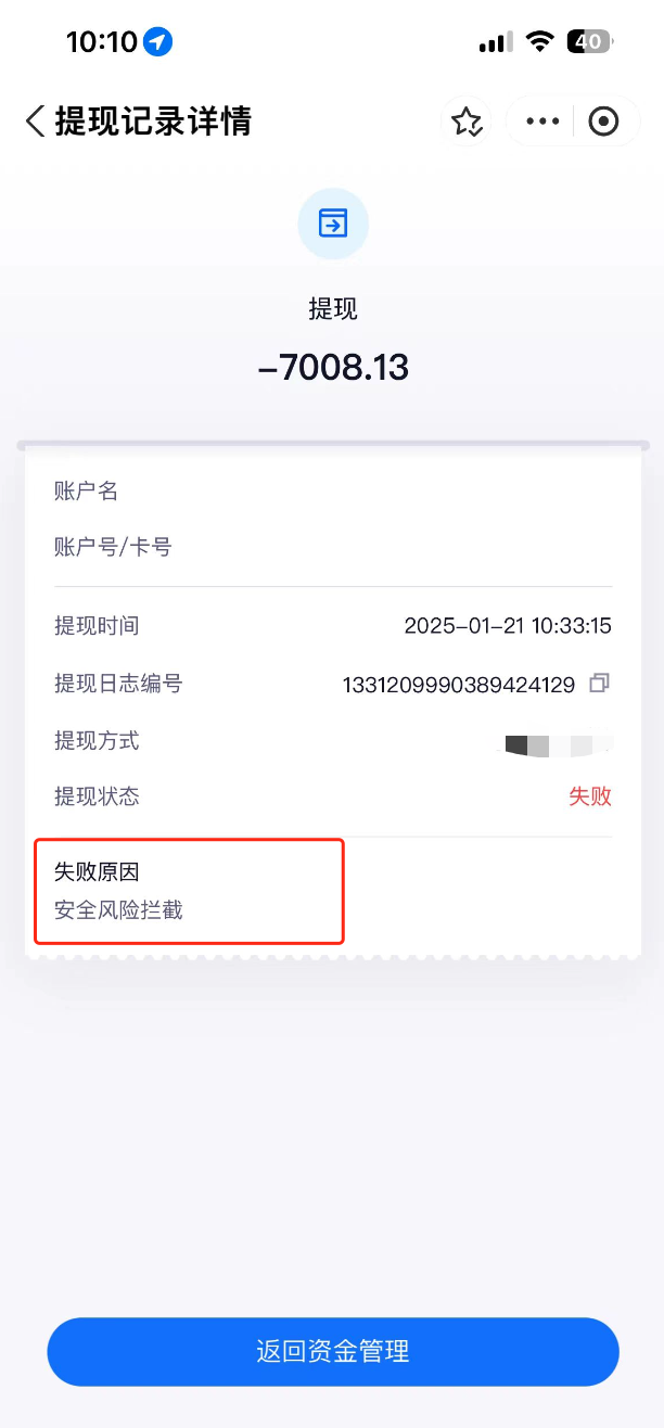 对于商管云-资金管理中提现后,提示提现失败冲正时,可在余额变动明细中点击「提现」那条记录,可在提现记录详情中查看失败原因,根据失败原因进行进行处理或联系网商咨询具体解决方案。