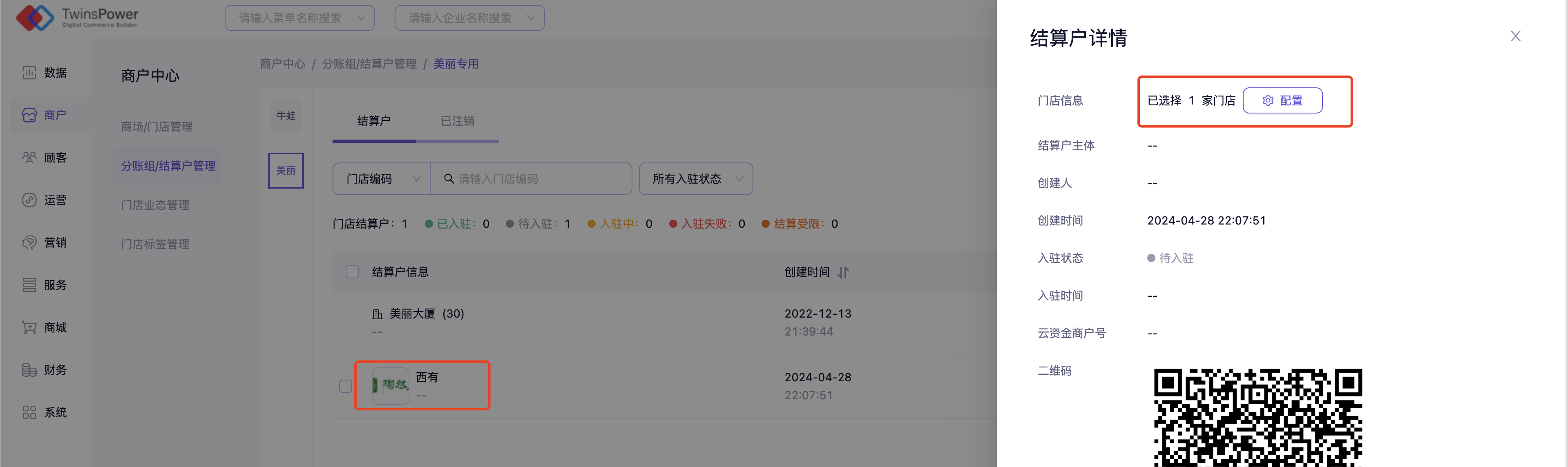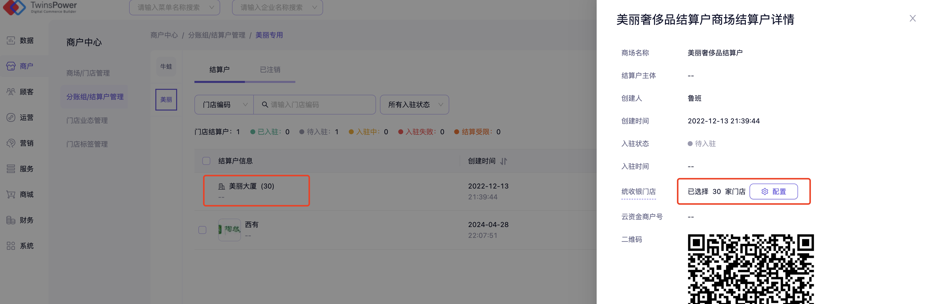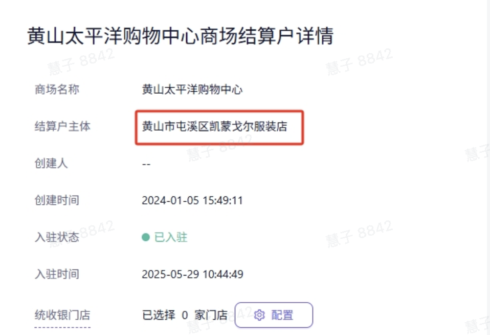 商场结算户不支持注销、变更。目前一般都是商场结算户入驻有误,才导致的需要注销,比如误操作将商场主体绑定成了某个门店,如下图所示。如商场结算户还未产生任何资金结算,账户内没有余额,可联系影能运营人员处理注销结算户。