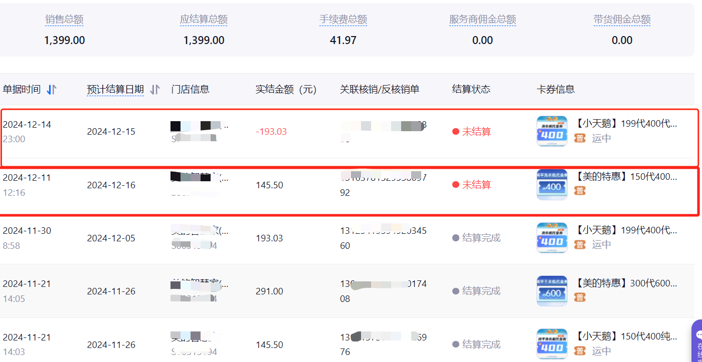 若门店未入驻结算户,则该门店所有结算订单都是未结算状态,无法自动结算。 门店入驻绑定结算户后,历史未结算的订单均会在次日11:00更新结算数据,包括营销补差、有价券划拨单等所有单据都会进行结算。