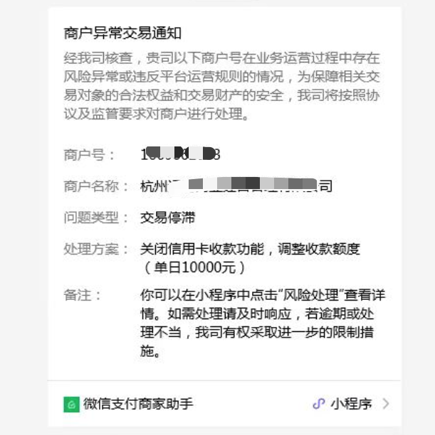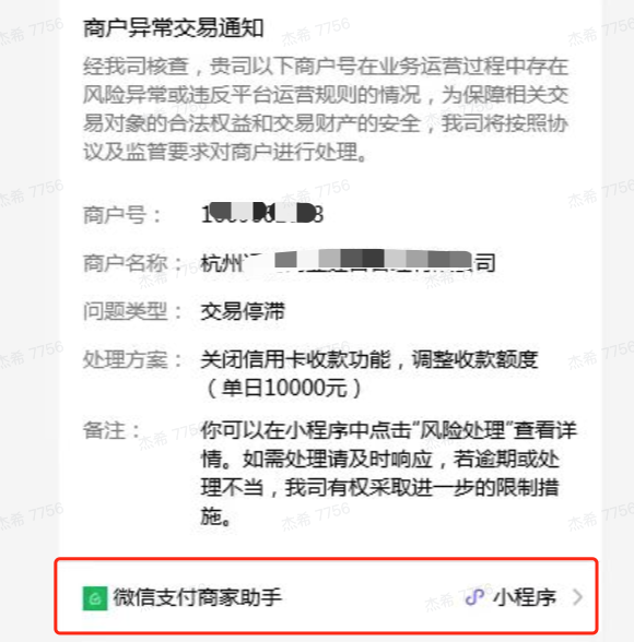 - 收到商户异常交易通知的管理员/运营人员,可直接点击页面中的小程序